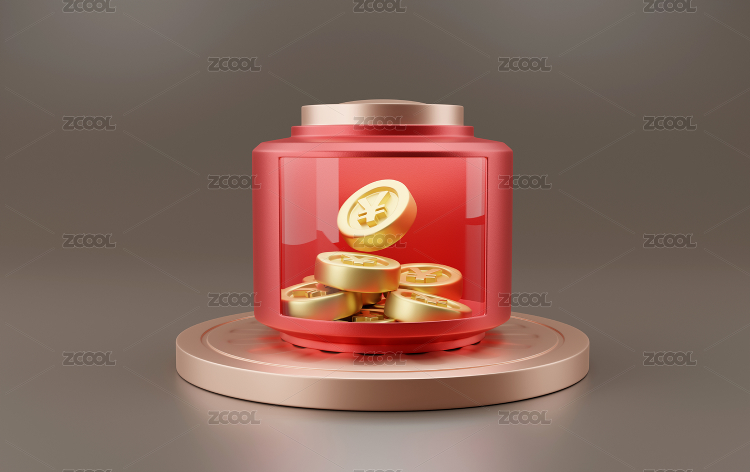 装有金币的红色立体透明玻璃的存钱罐子
