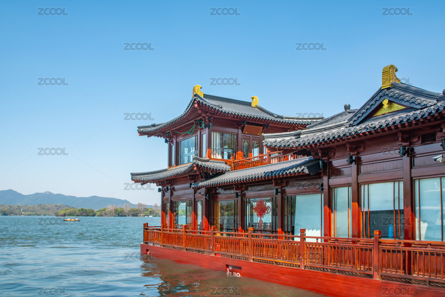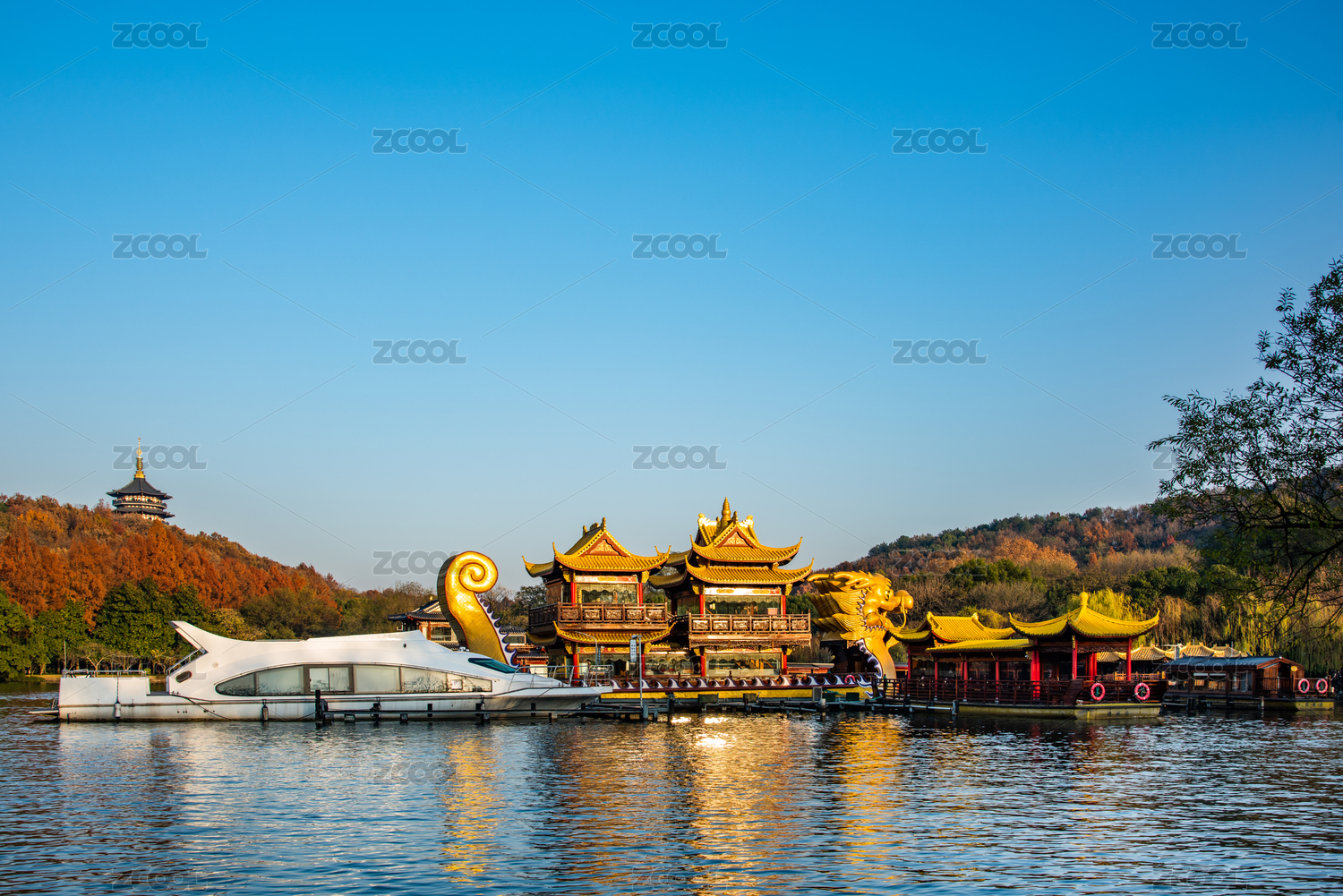 杭州西湖游船向苏堤方向行驶,湖面掀起涟漪