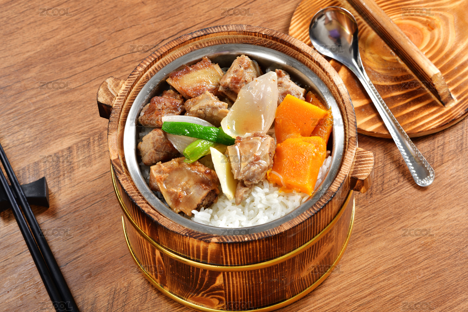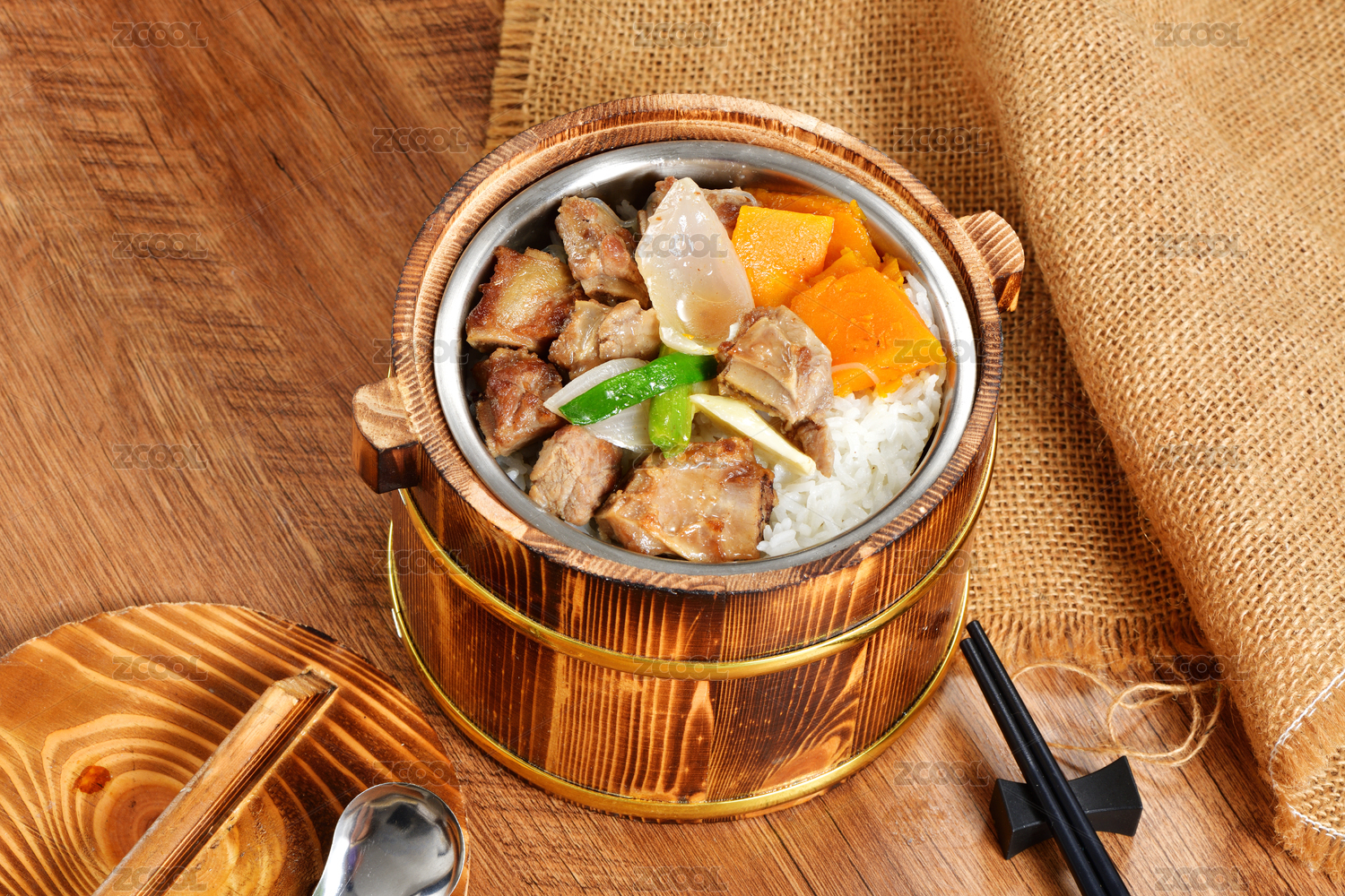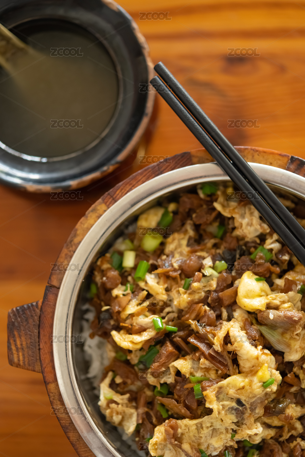 外婆菜炒蛋木桶饭配汤顶视图垂直画幅