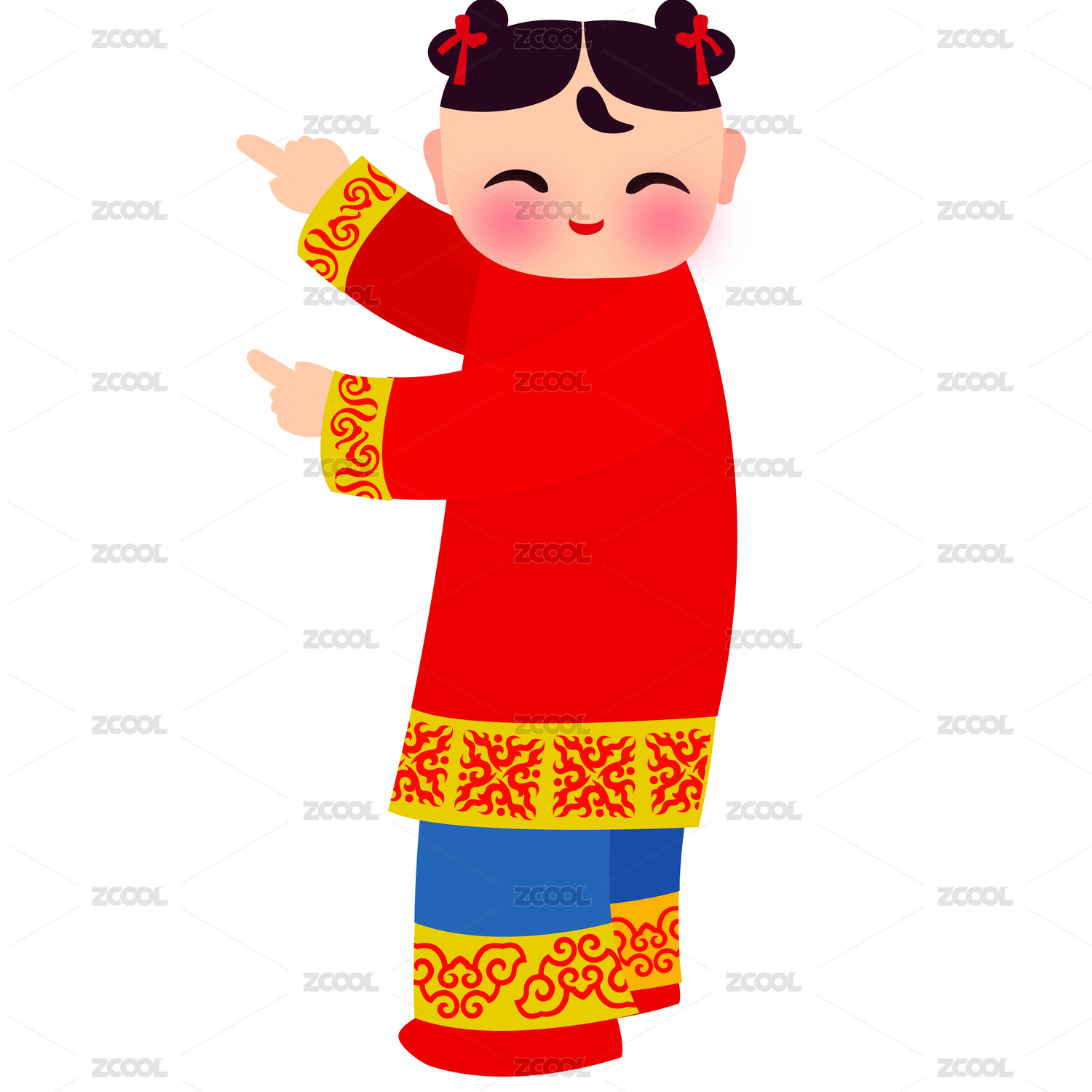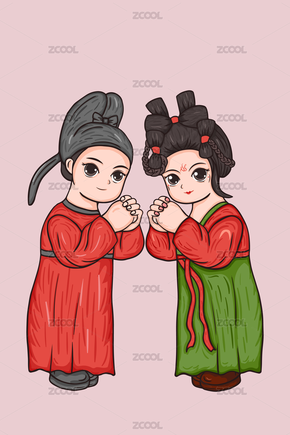 春节剪纸聚宝盆金童玉女年画娃娃矢量插画