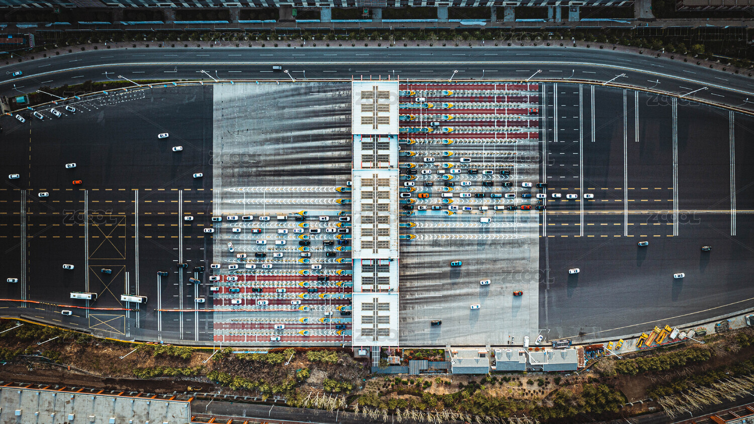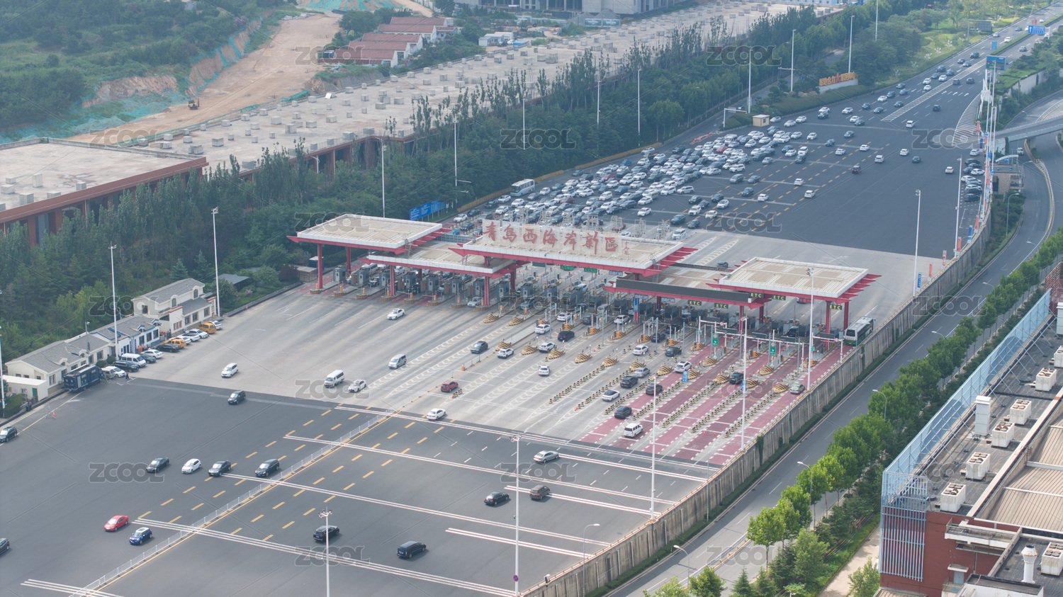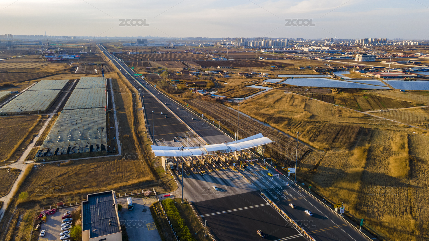 中国天津通往大港的津港高速大港收费站航拍俯视