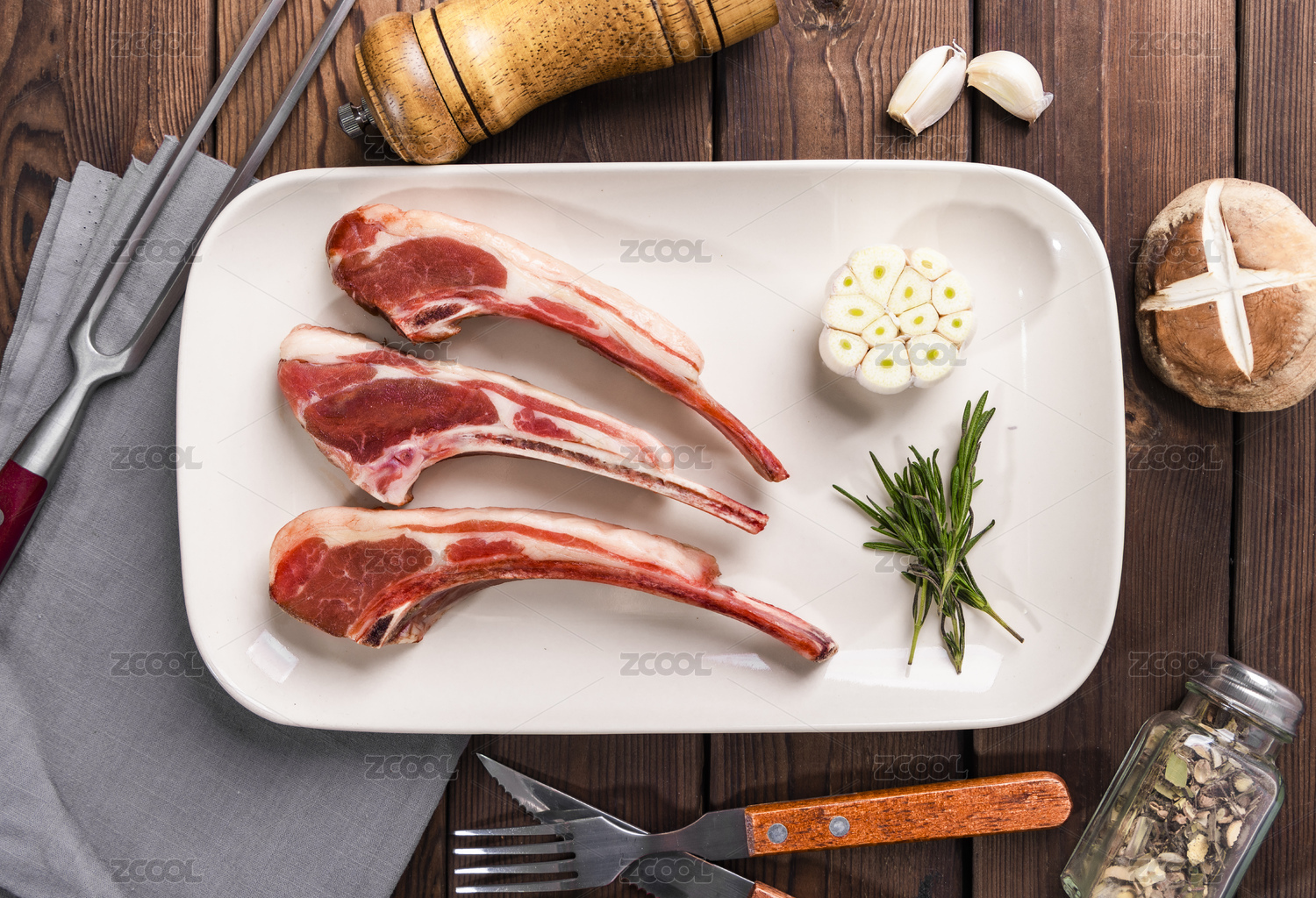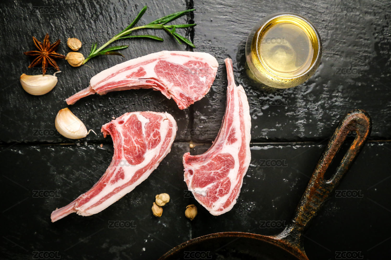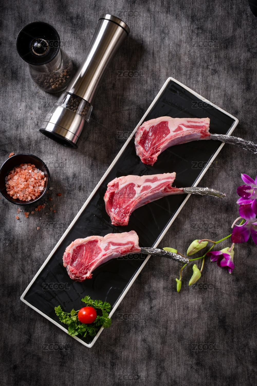 黑底上放着新鲜羊排