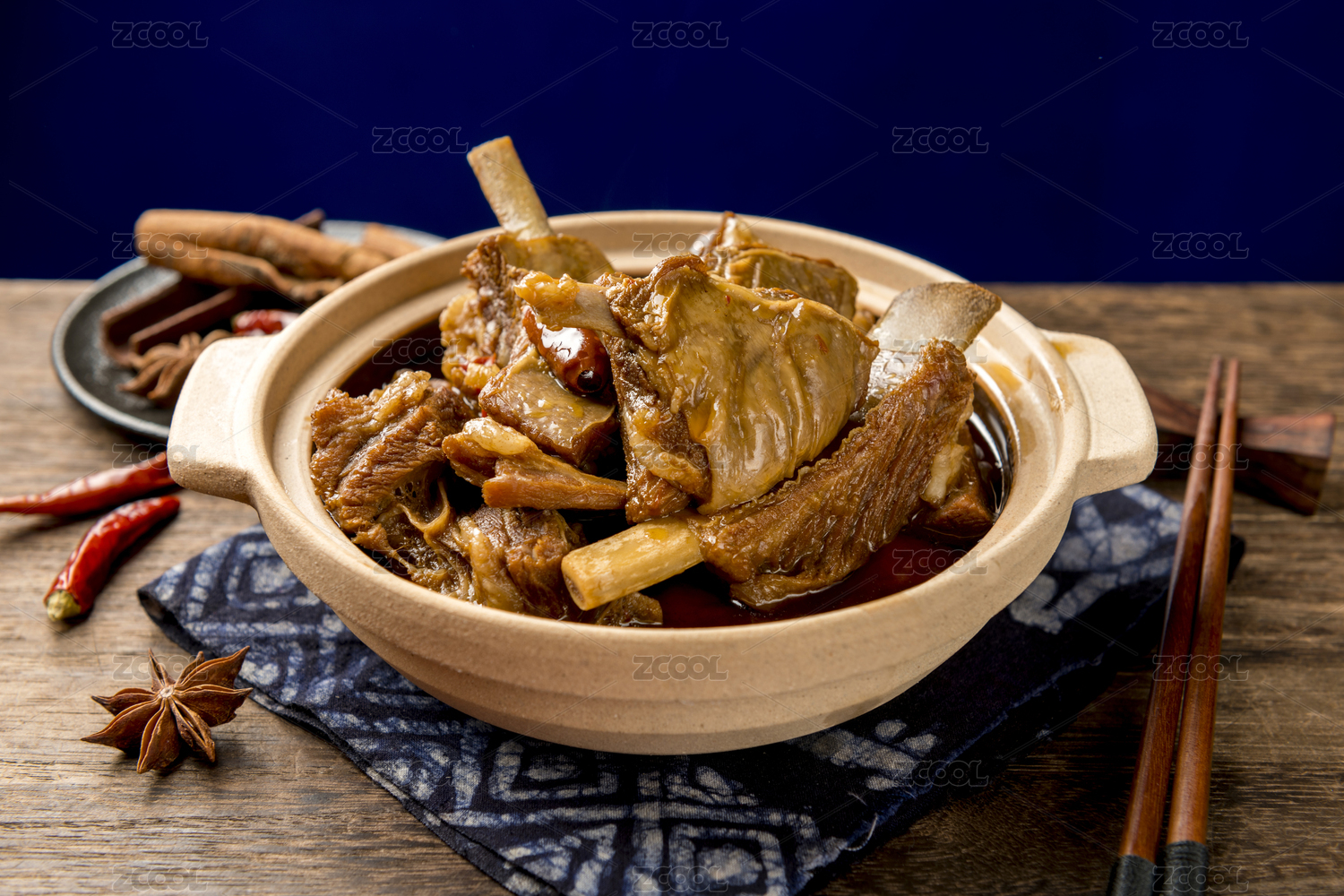 一砂锅红焖羊排摆放在木桌面上特写