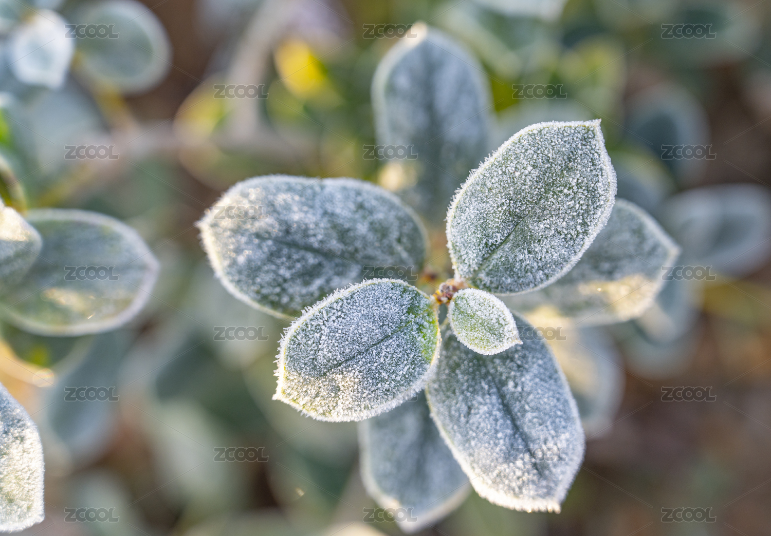 冬季结霜的海桐枝叶特写