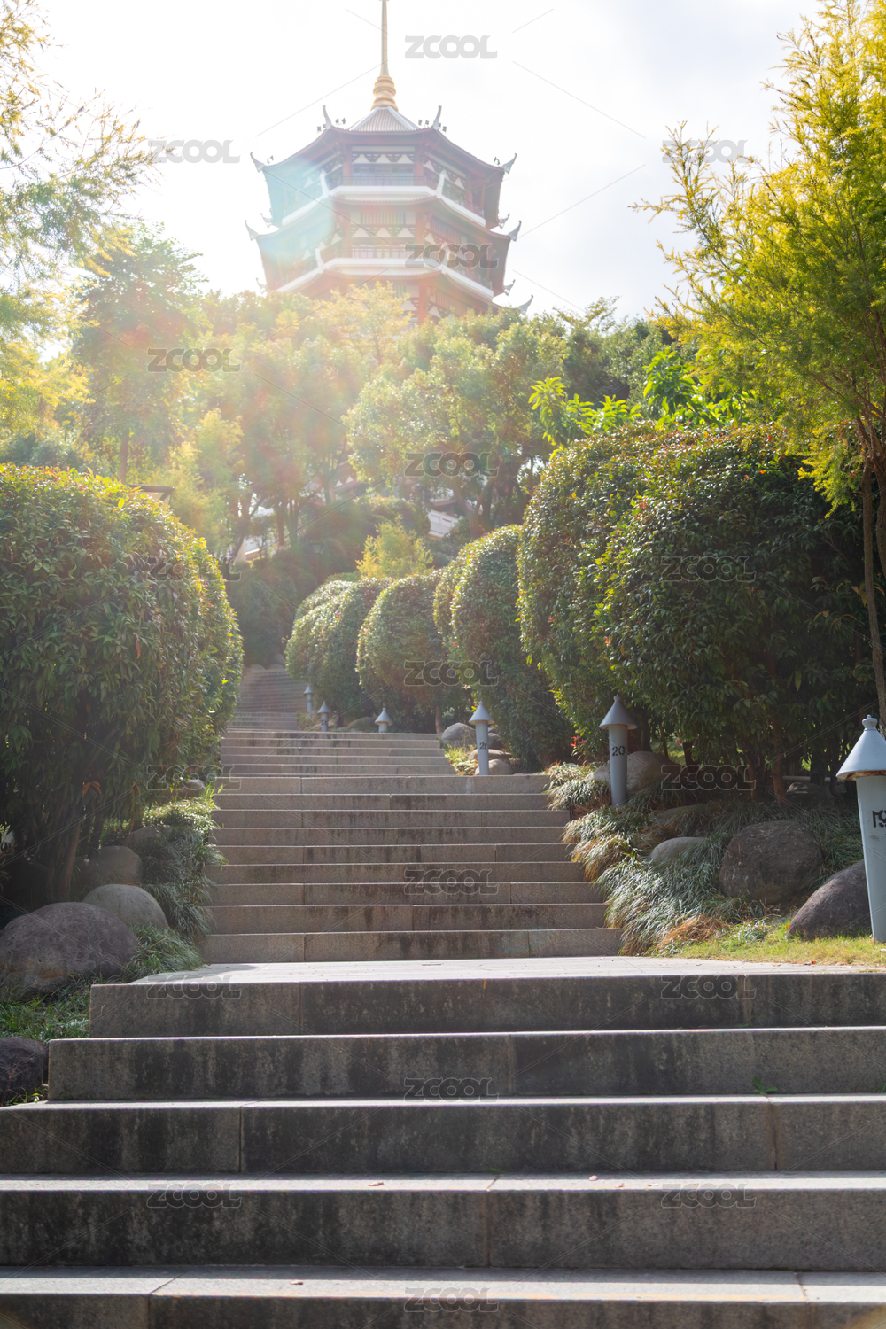 厦门市集美区集美市民公园古塔阶梯的晨光