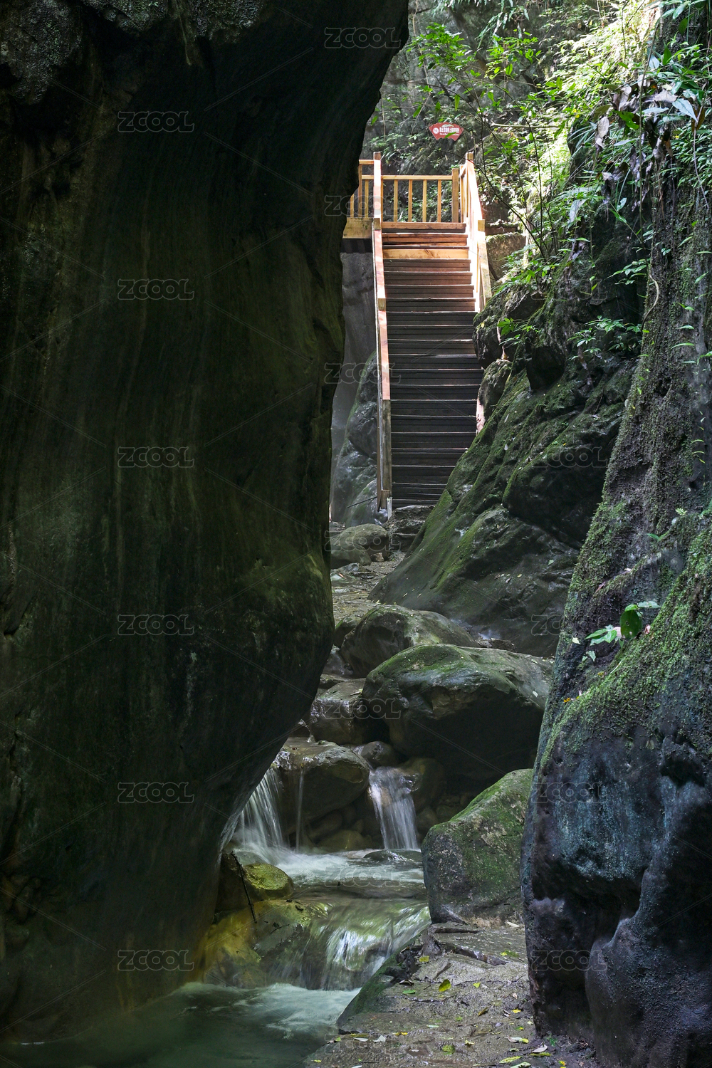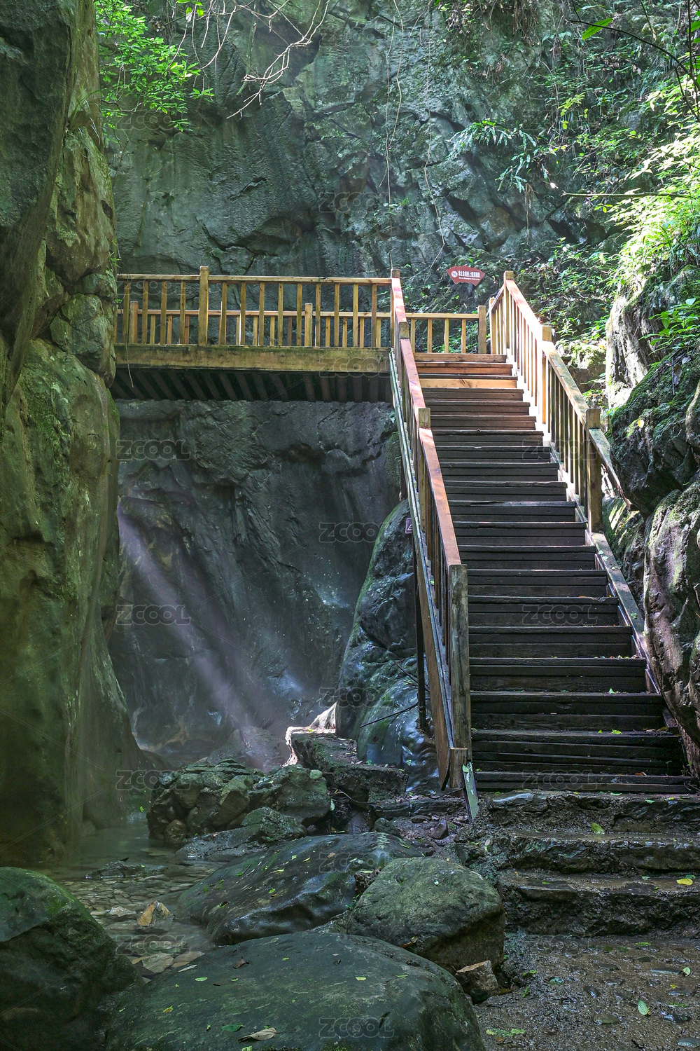 湖北南漳县翡翠峡峡谷光影下通往山谷的阶梯
