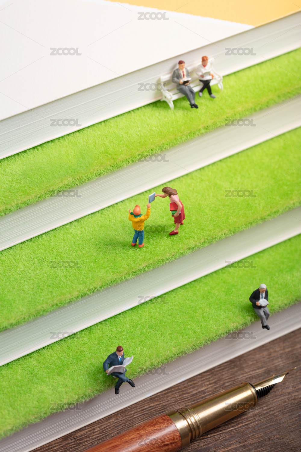 微缩创意书本草地阶梯上阅读的人群