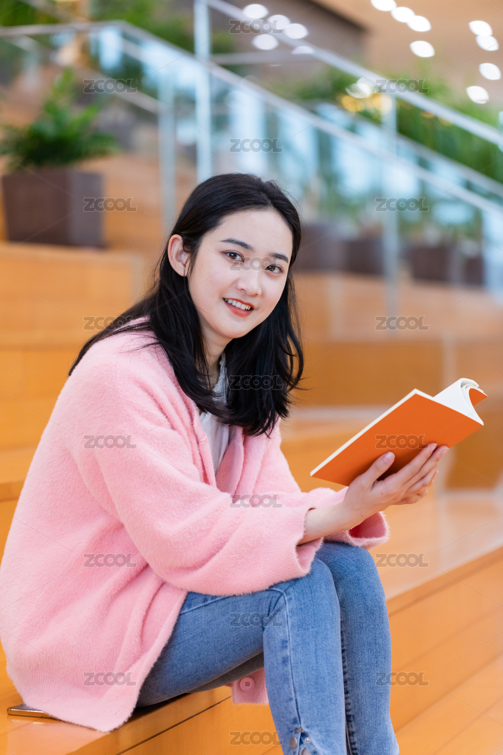 大学生坐在阶梯上手拿一本书