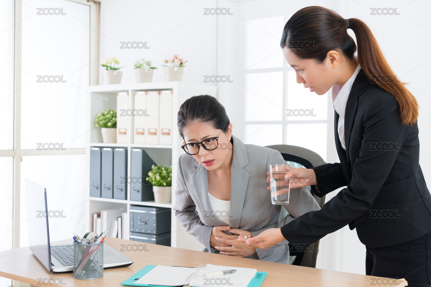 年轻优雅的女员工知道公司的经理让肚子疼痛苦的问题,并准备医疗丸照顾她。