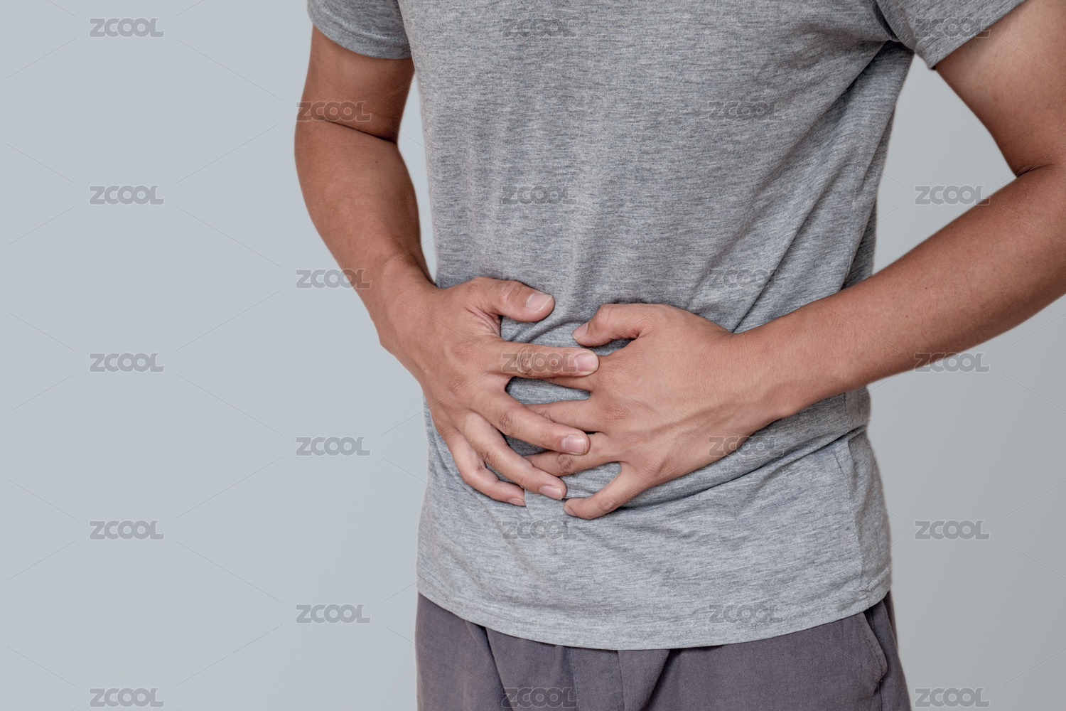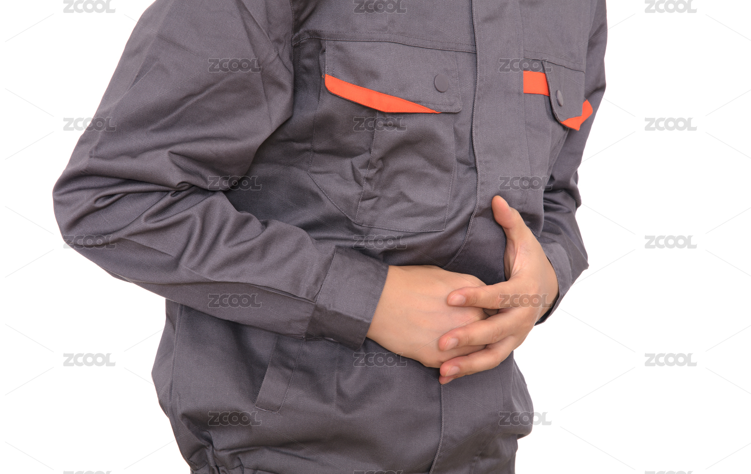 肚子疼痛的工人手捂着肚子