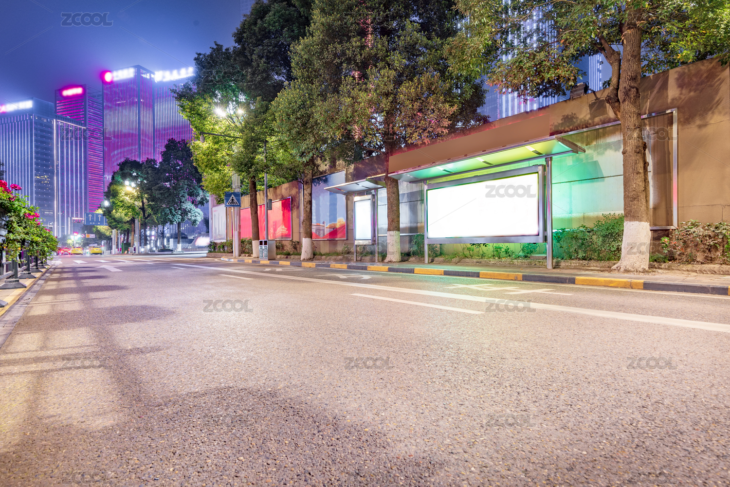 夜晚的城市公交站台空白广告牌