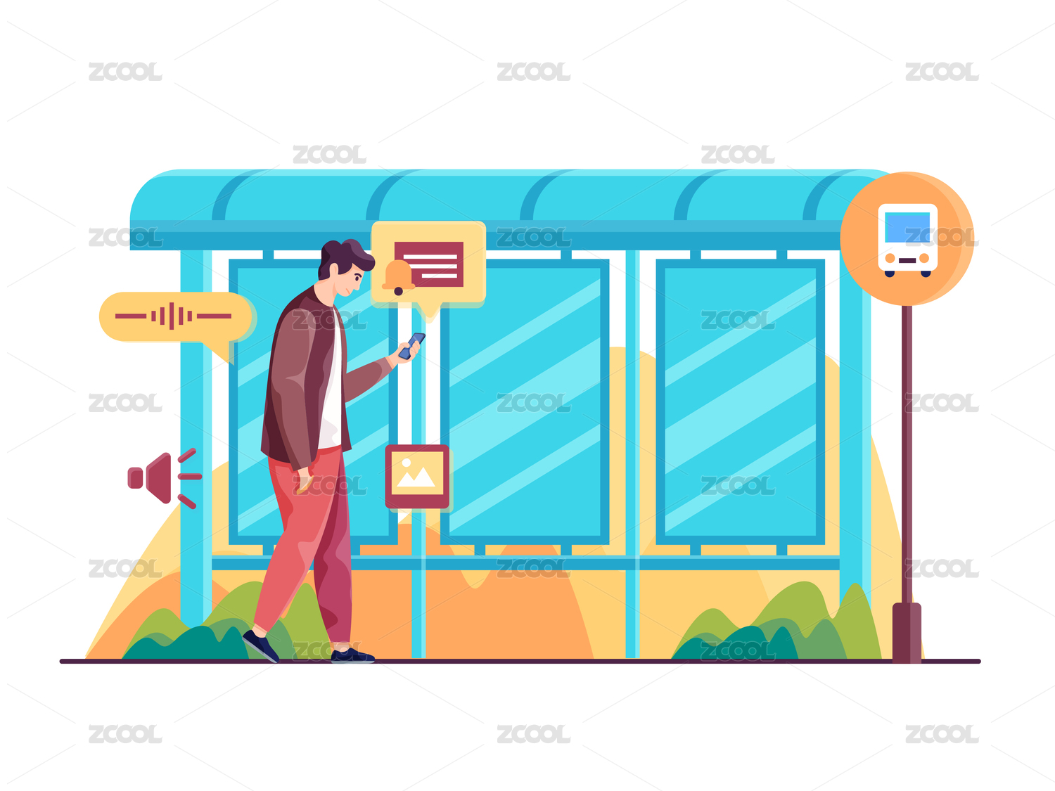 男子站在公交站台前看手机矢量插画