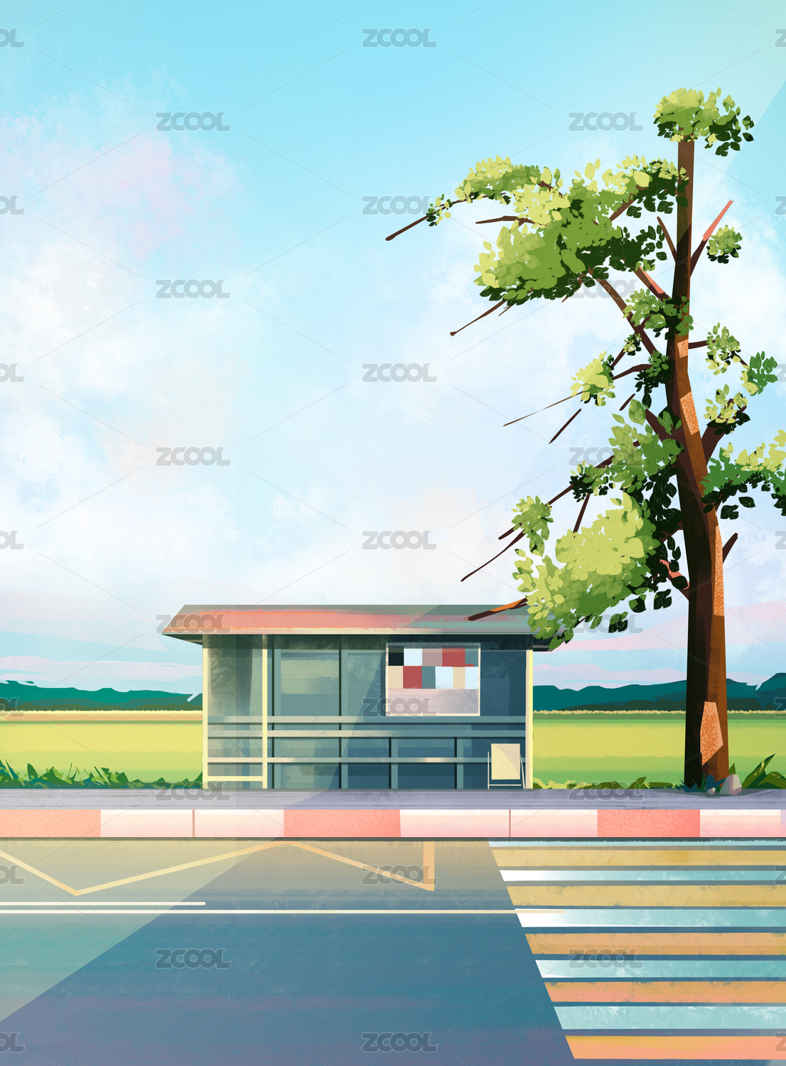 乡间马路边公交站台日系场景插画
