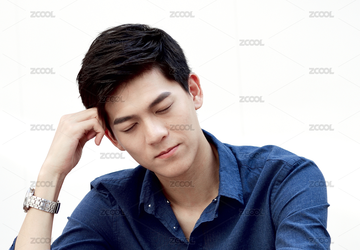 坐在办公室桌前闭眼烦恼的年轻男性白领