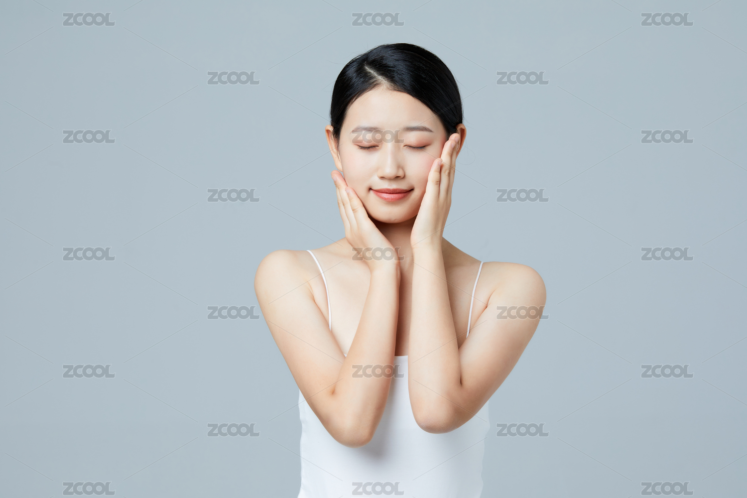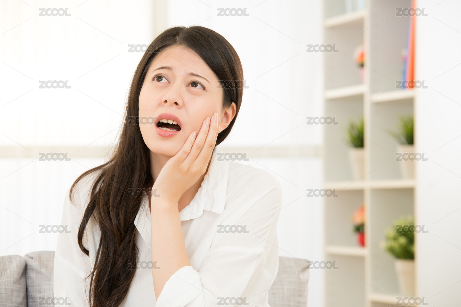 而在家里坐在沙发上牙痛年轻女子抚摸她的脸颊,保持闭眼。生活方式和健康理念的混血亚洲的中国模式。