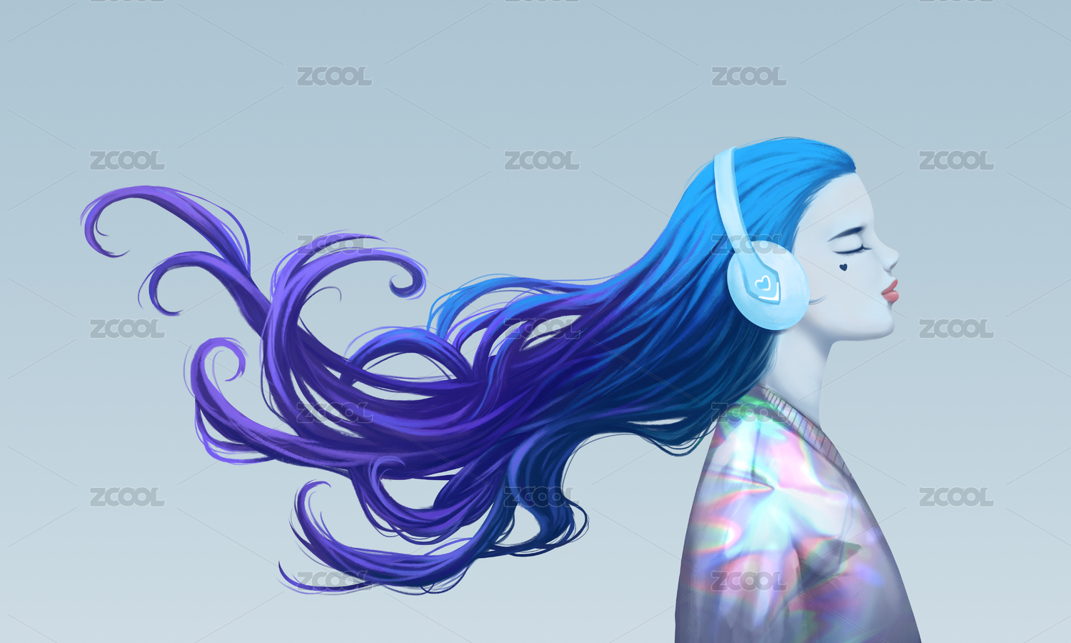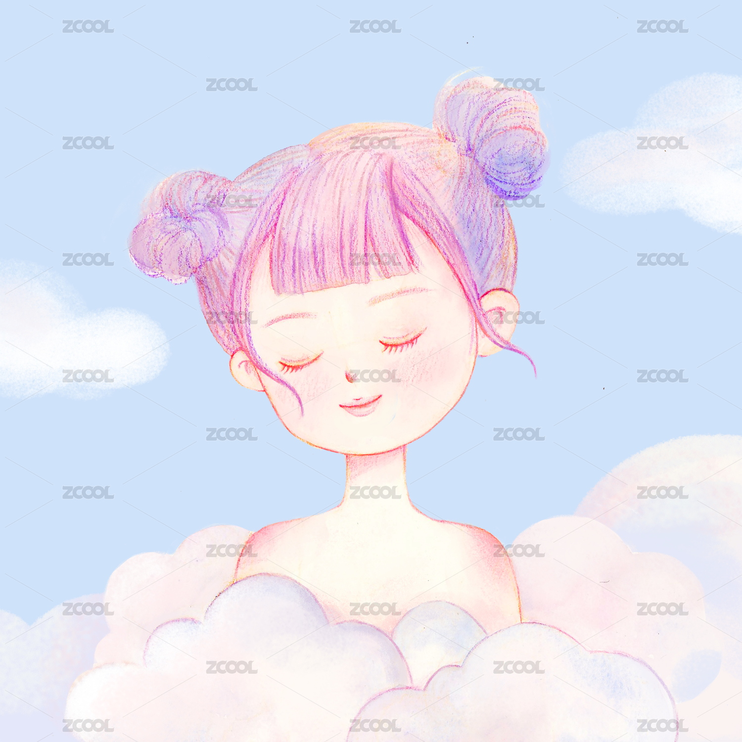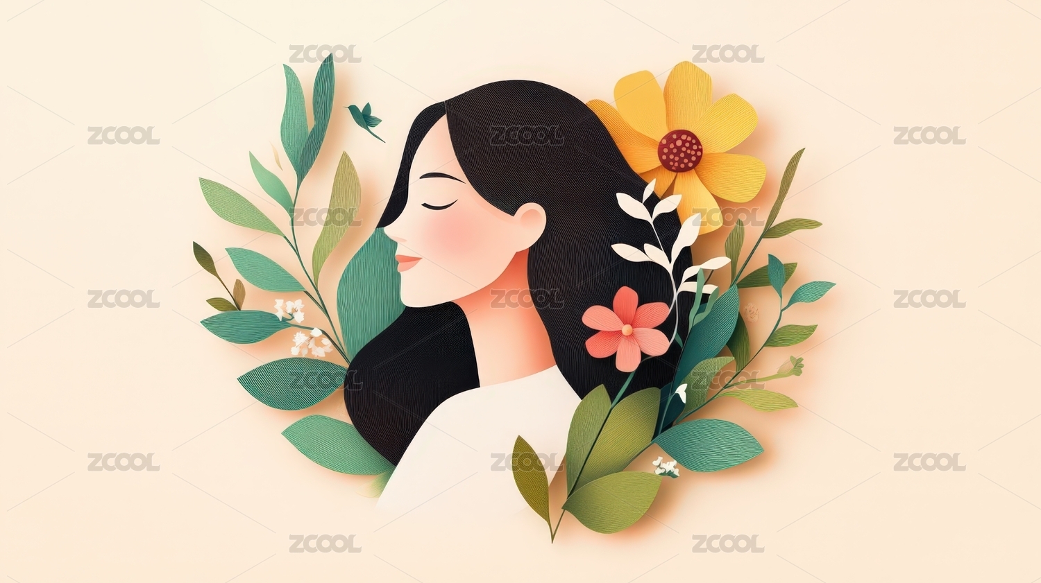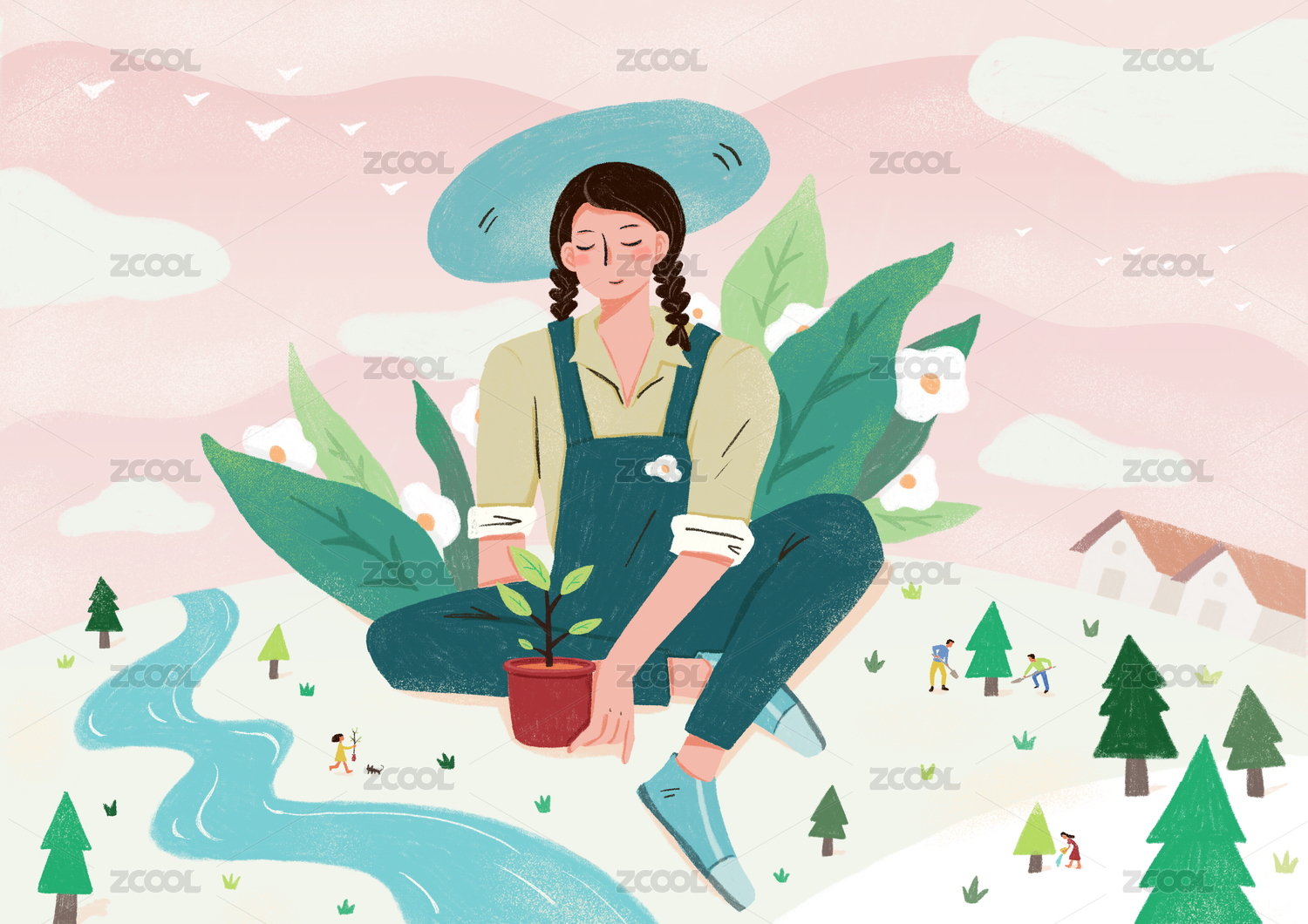 绿色植物旁闭眼微笑的长发少女 森系可爱女孩水彩插画