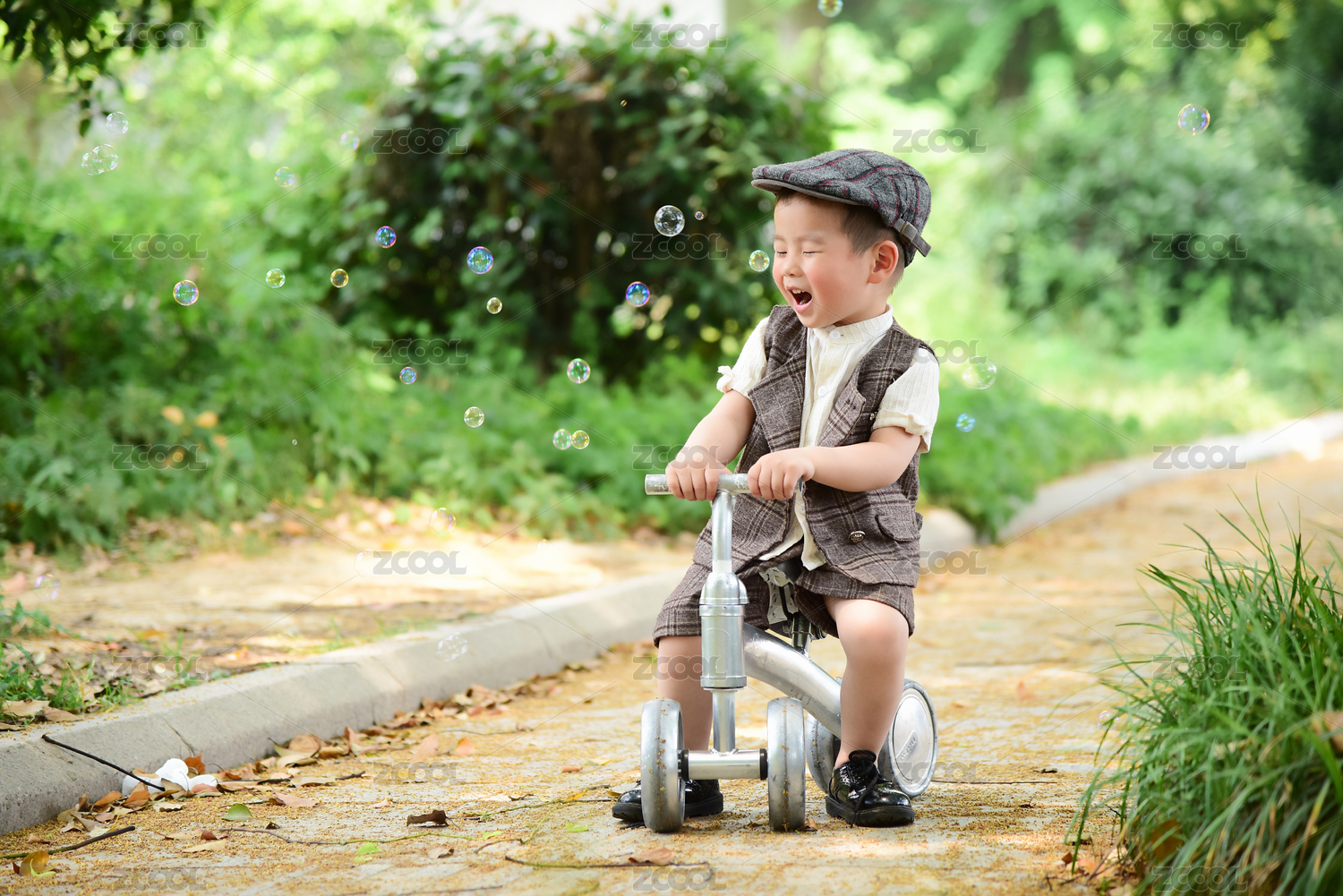 阳光下林荫小路上穿着短袖西服坐在滑滑车上闭眼大笑的小男孩