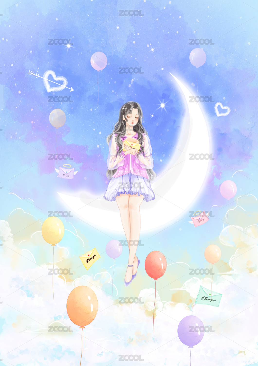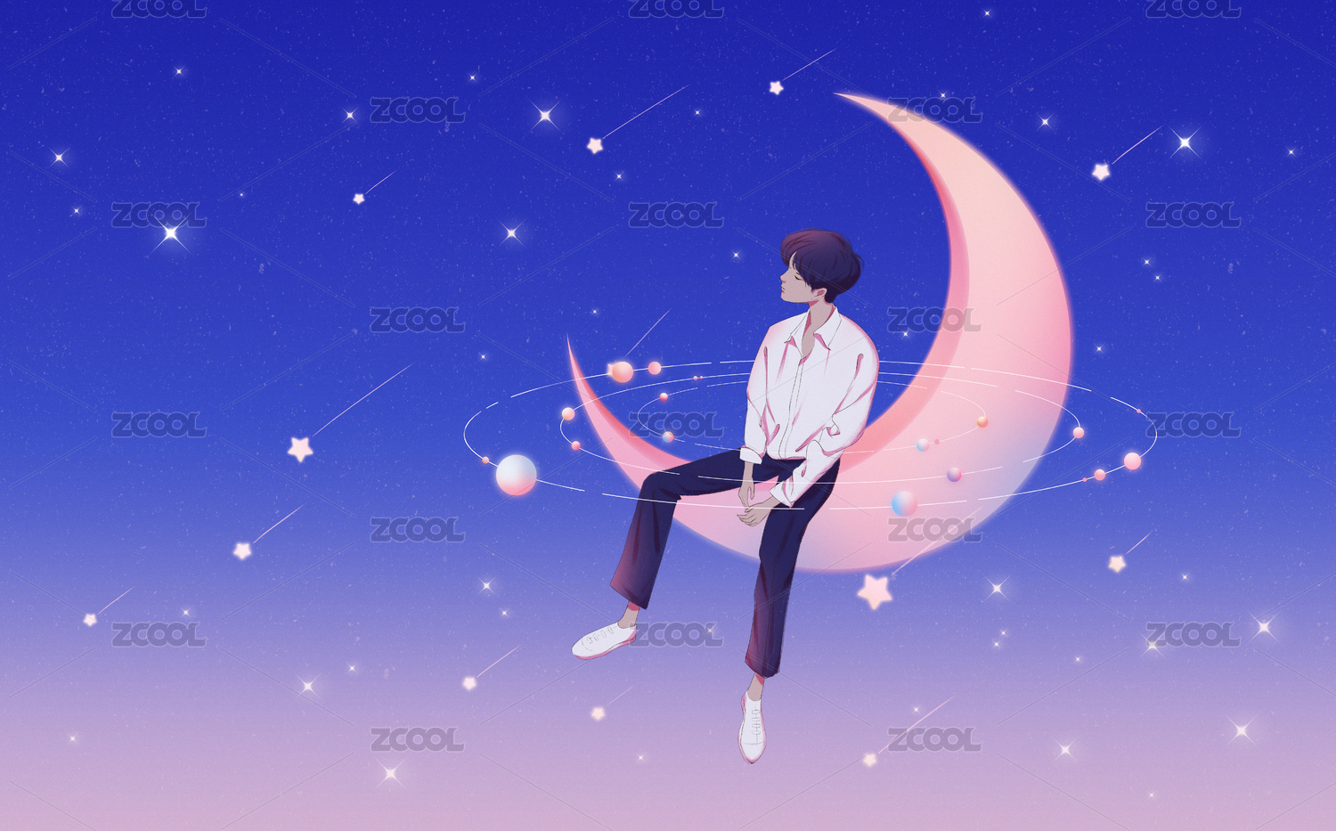 行星围绕的男孩坐在月亮上闭眼思考梦幻插画横版
