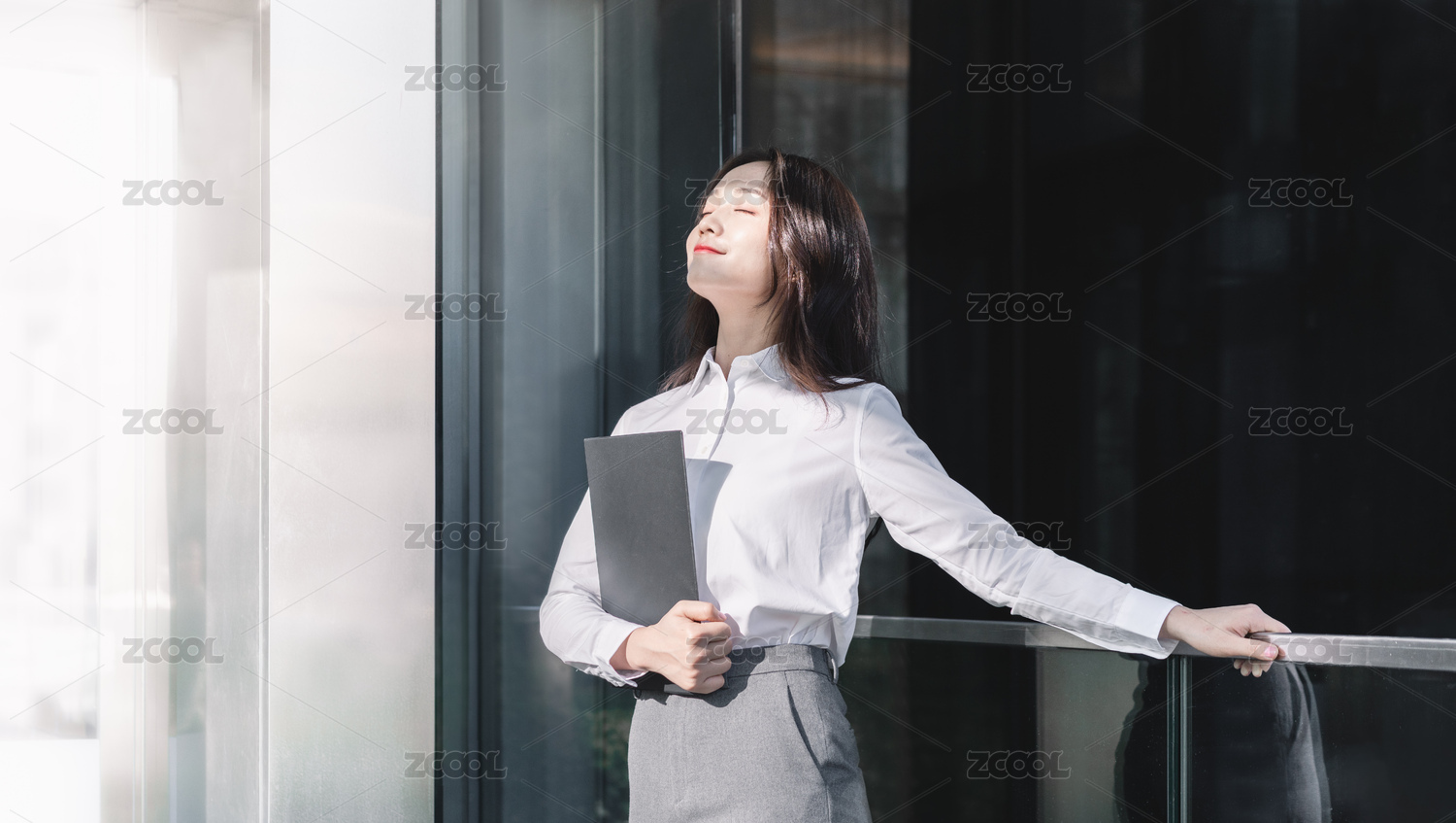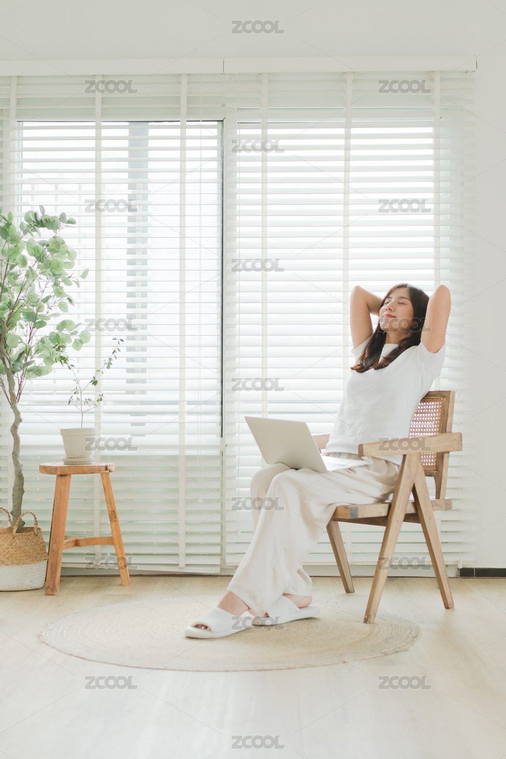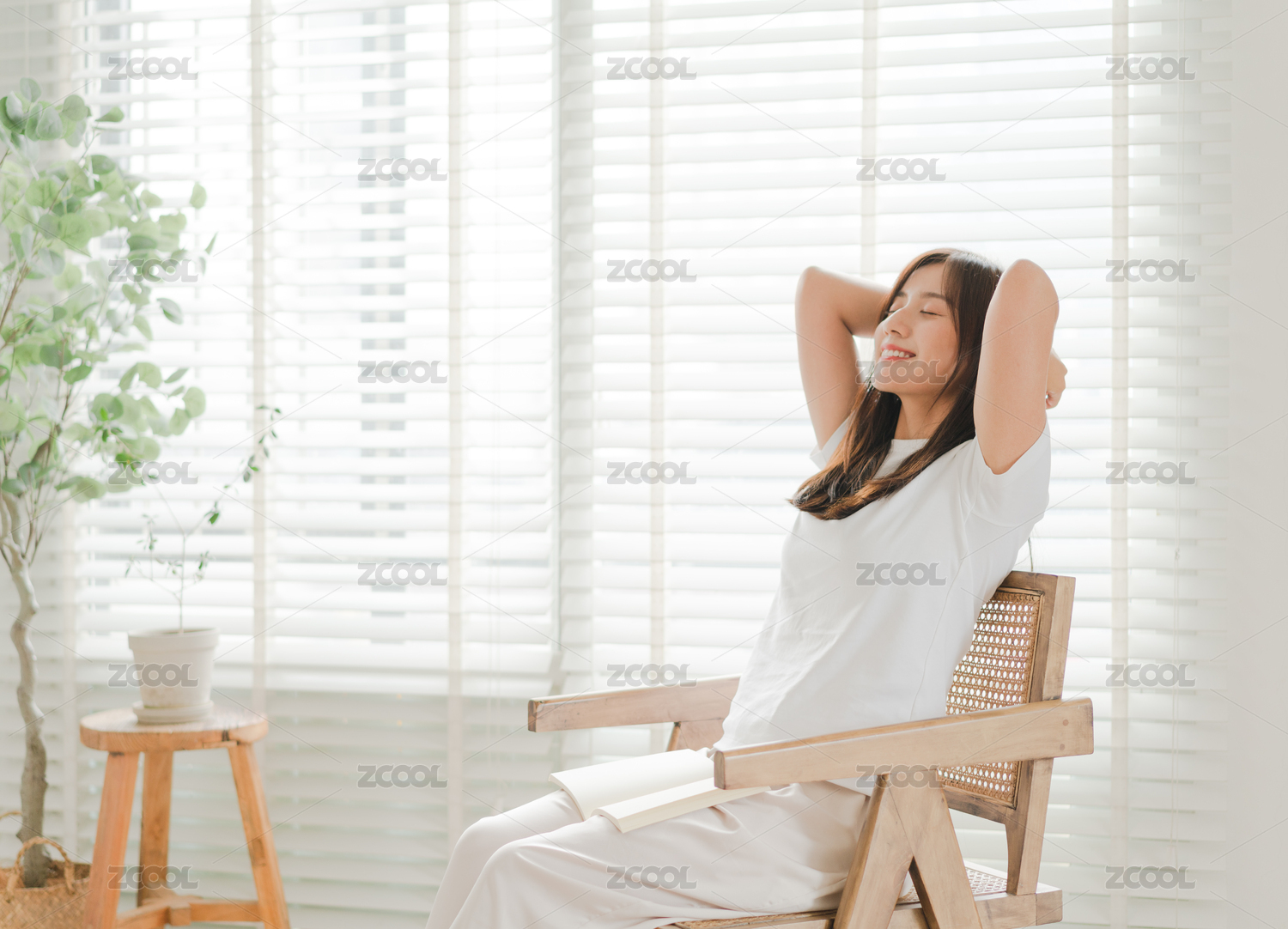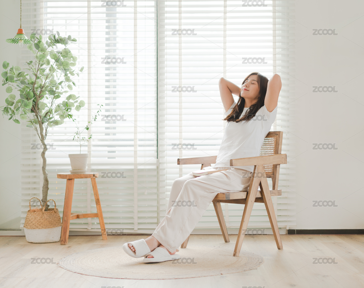 女生坐在百叶窗边的椅子上双手抱头闭眼休息