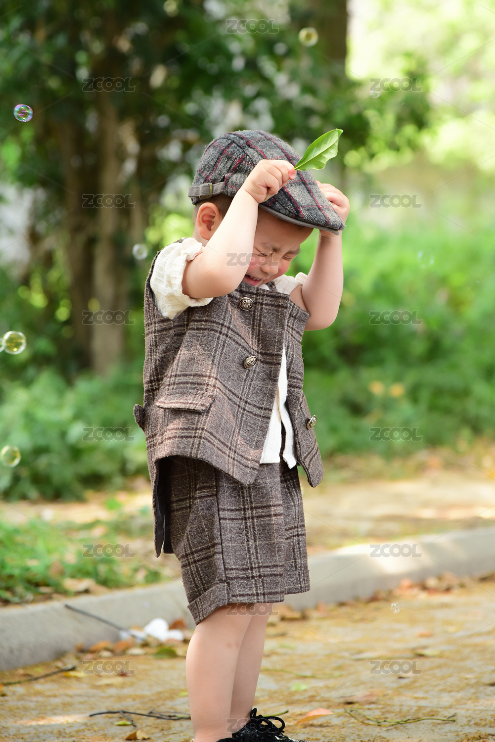 阳光下林荫小路上穿着短袖西服抱头闭眼大笑的小男孩