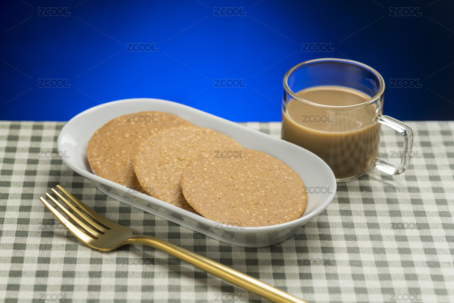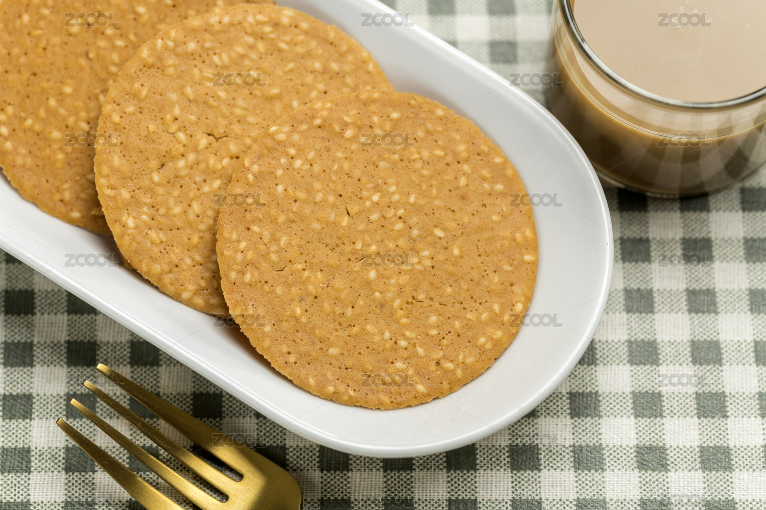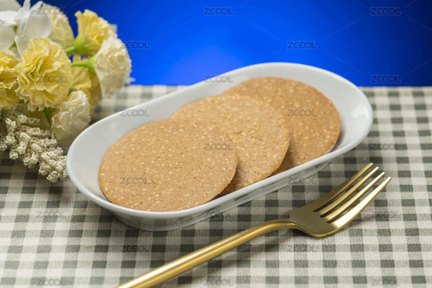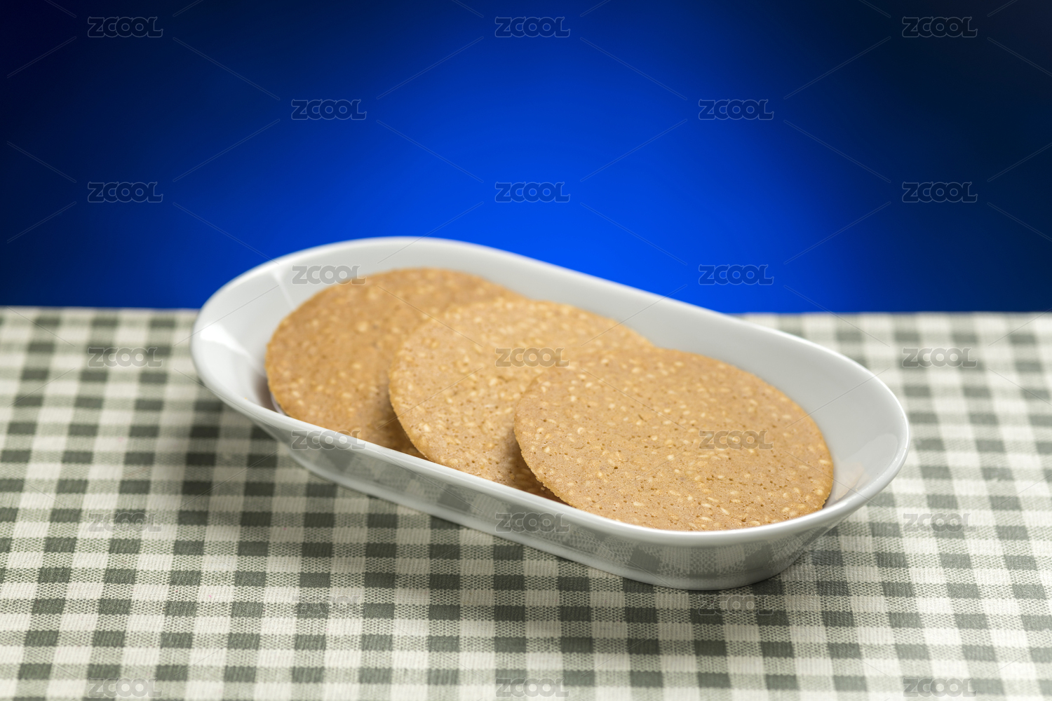 一盘芝麻薄饼芝麻饼干特写格子桌布背景