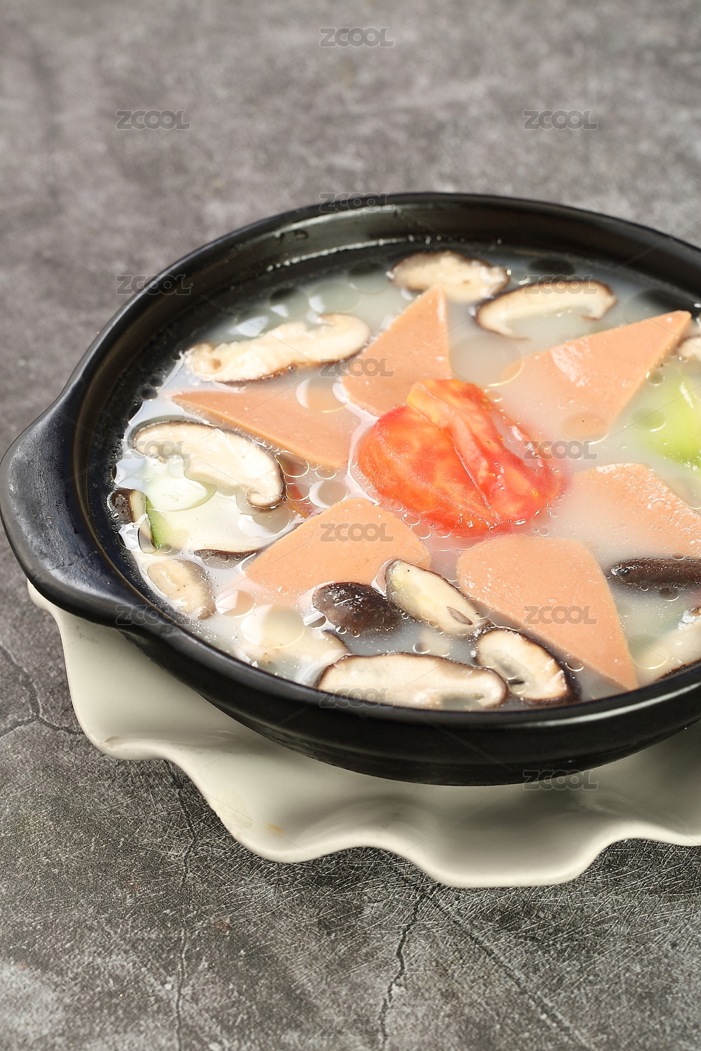 黑色砂锅里的香菇火腿肠番茄三鲜汤