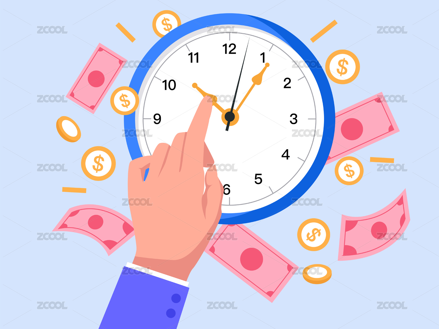 手拨动时钟指针产生钱币矢量插画