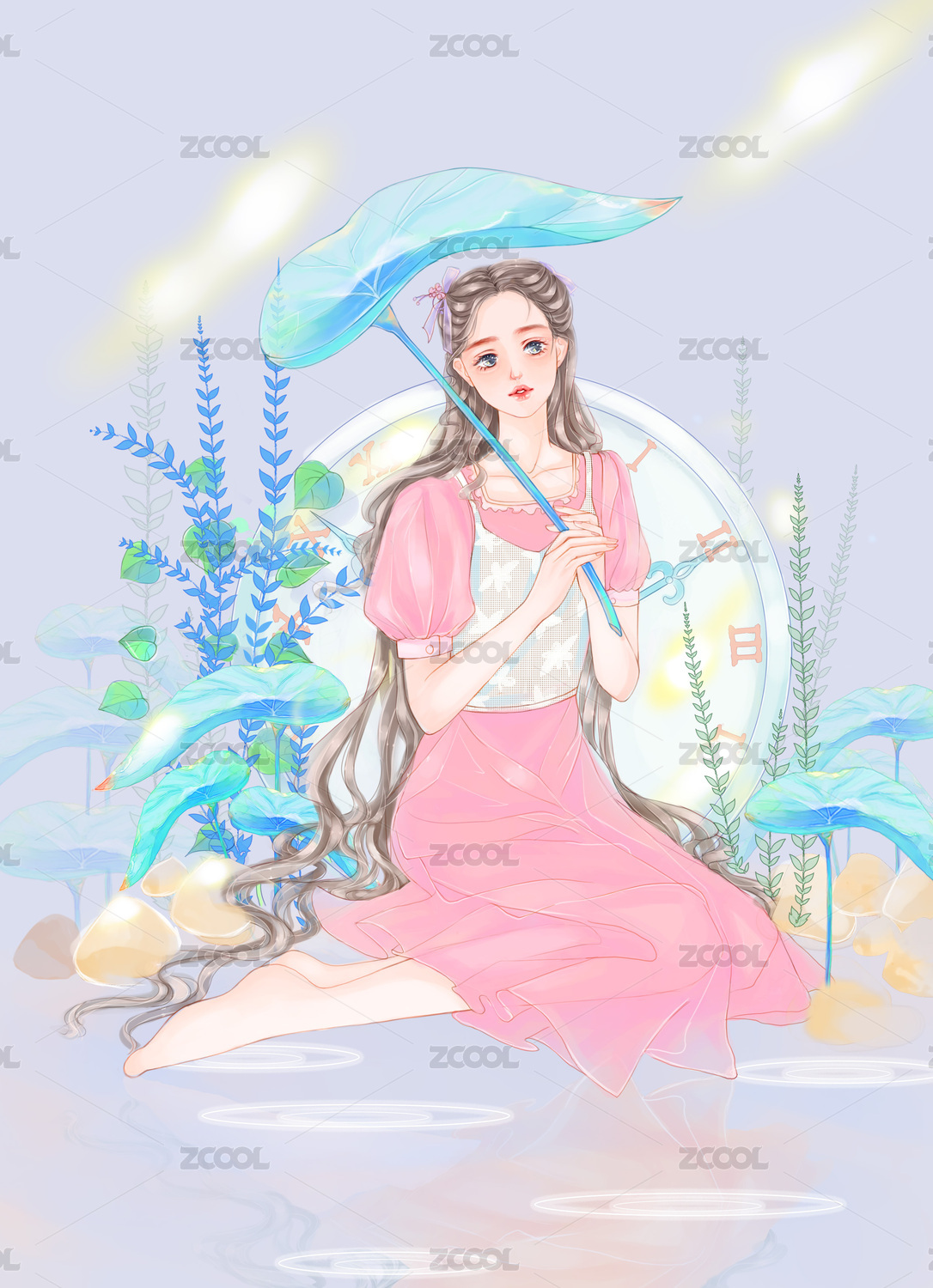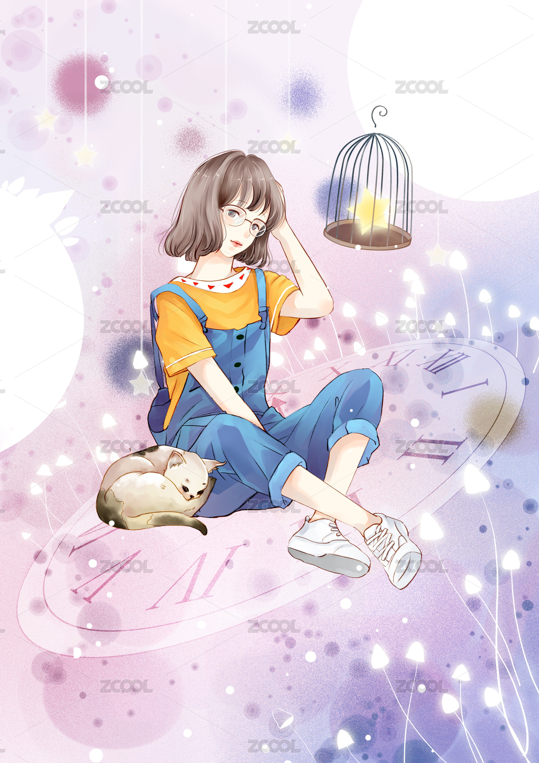 在蓝粉色空间里猫咪和女孩坐在时钟上