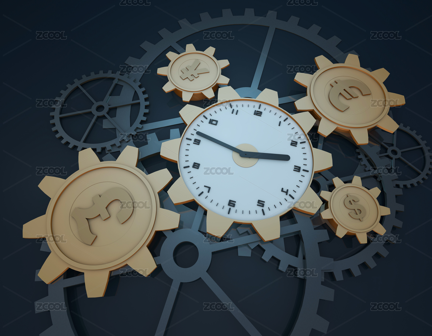 货币符号齿轮与时钟齿轮相互连接转动,代表着时间就是金钱与时间的积累创造财富