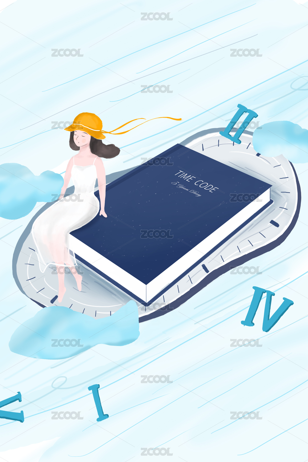 穿着白色连衣裙带着黄色帽子的女孩坐在融化的时钟上在时间的河流里漂流