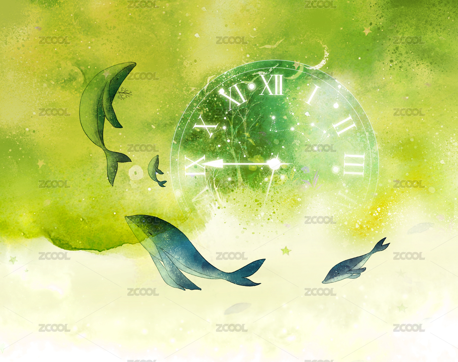 围绕绿色天空时钟起舞的鲸鱼群