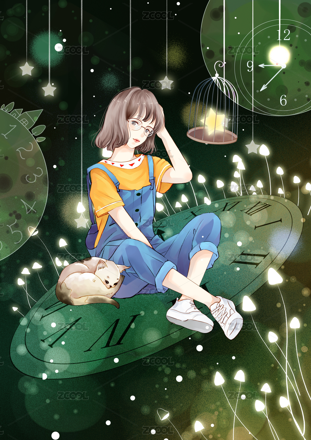 在墨绿色空间里猫咪和女孩坐在时钟上