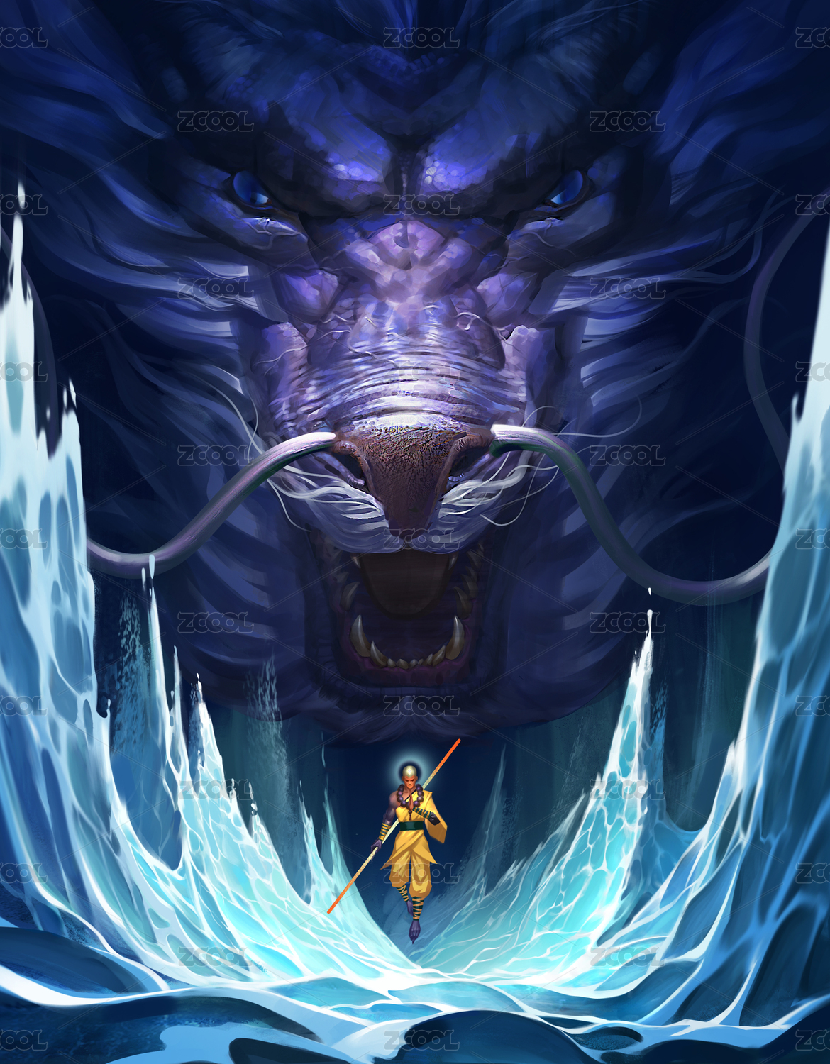 龙和僧人在海上,插画