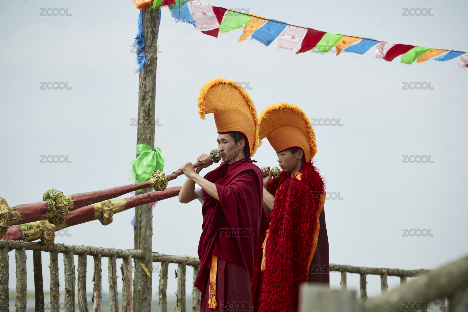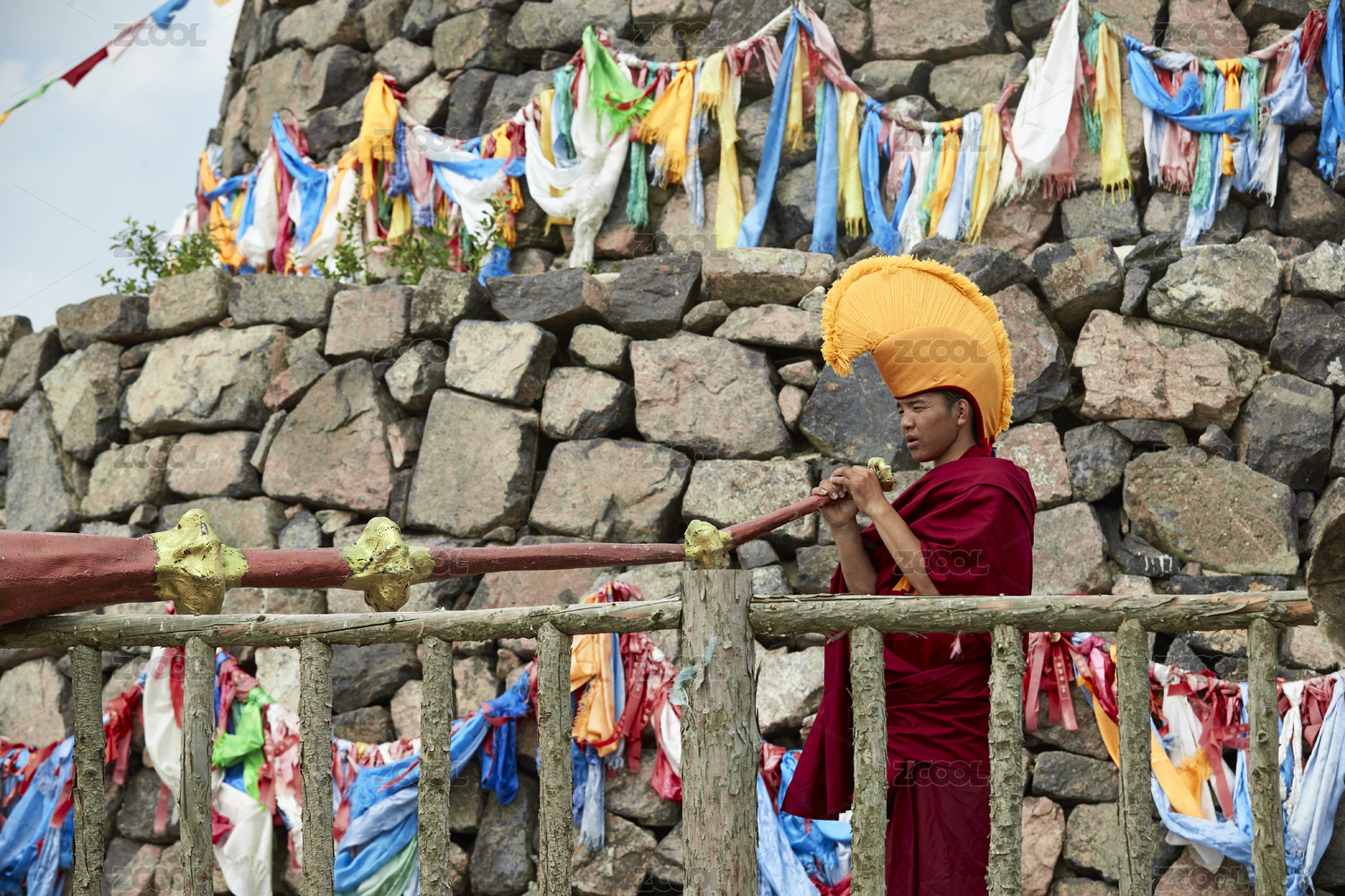 在敖包上吹响铜号的喇嘛僧人