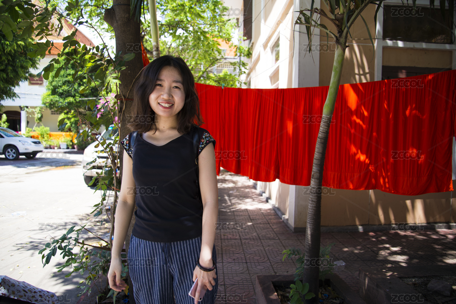 站在僧人晾晒的衣服旁边的中国女孩
