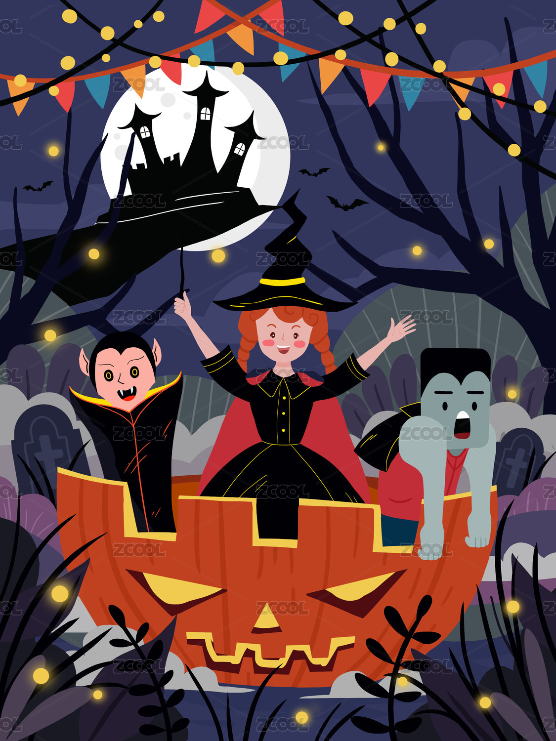 手绘卡通万圣节鬼怪魔女僵尸吸血鬼南瓜插画