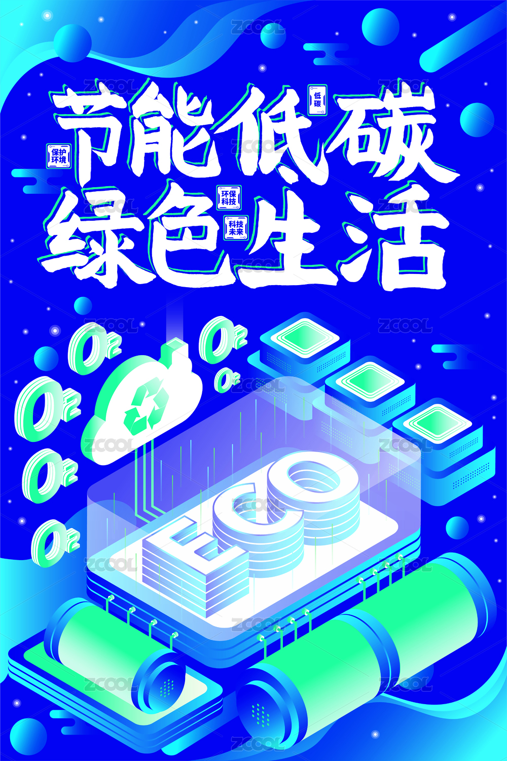 科技环保节能低碳绿色生活2.5D插画