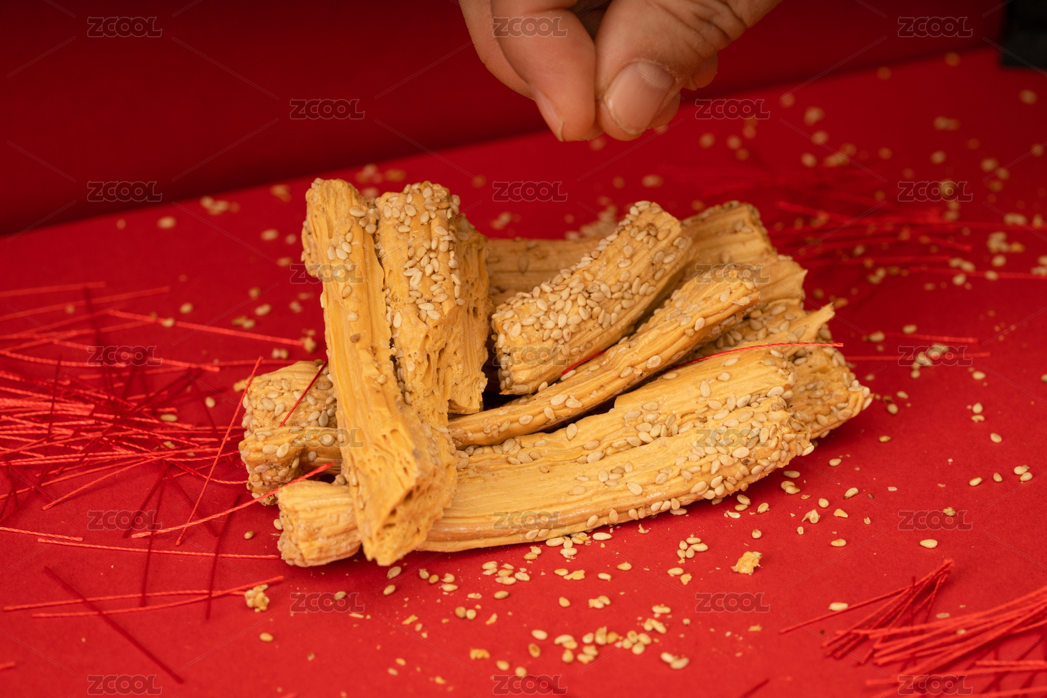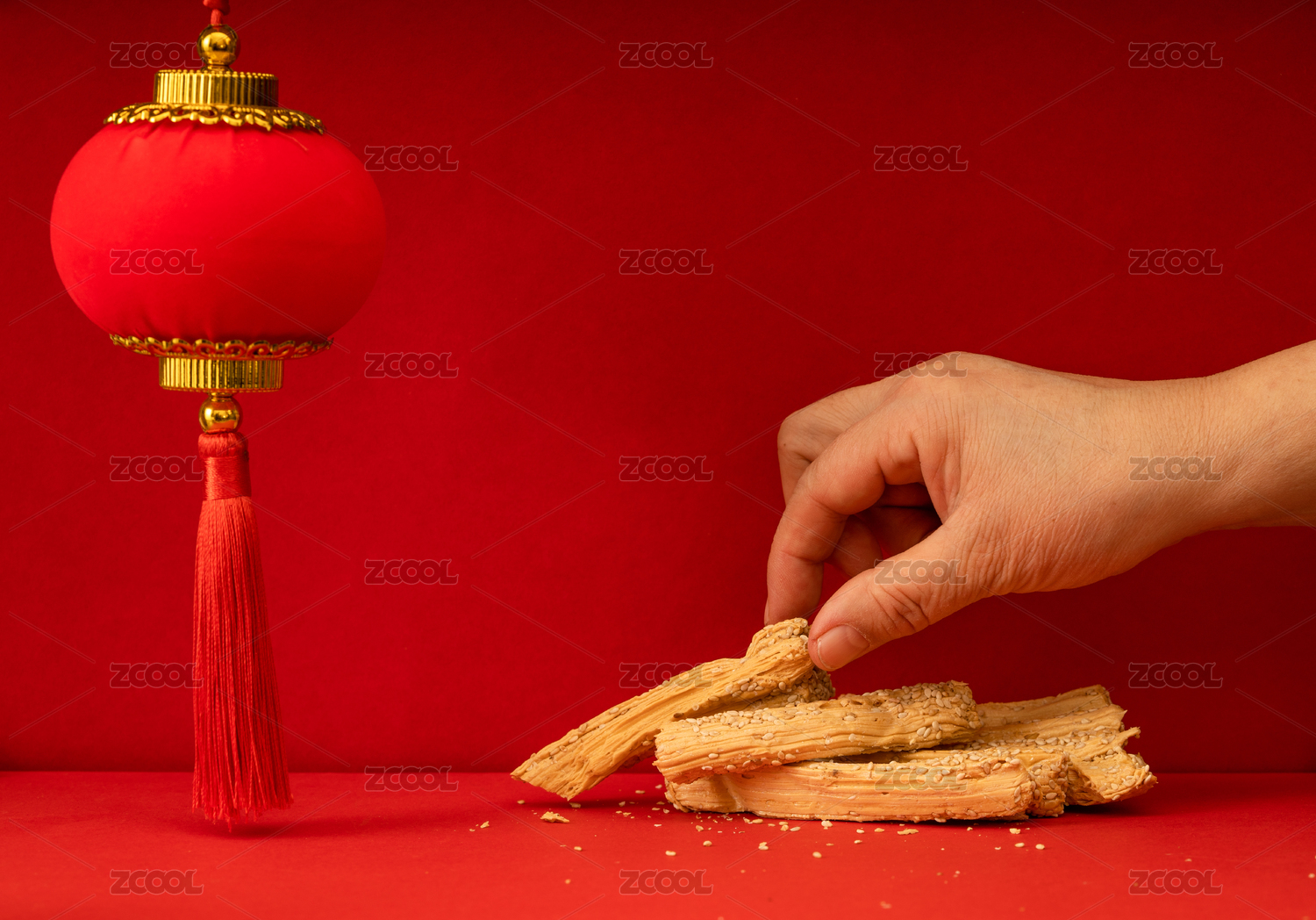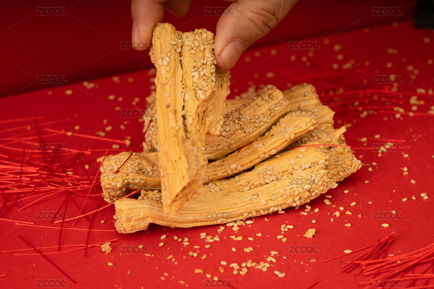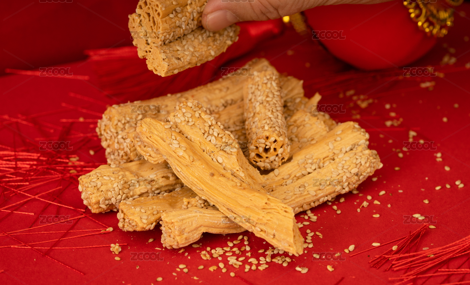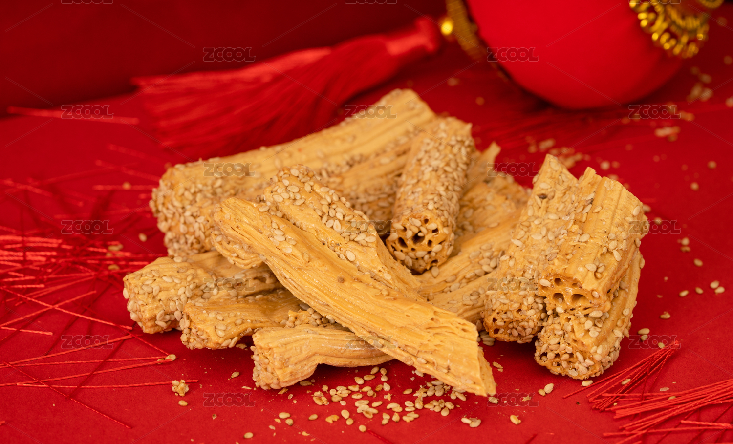 传统甜点灶糖放在充满节日气氛红色背景下