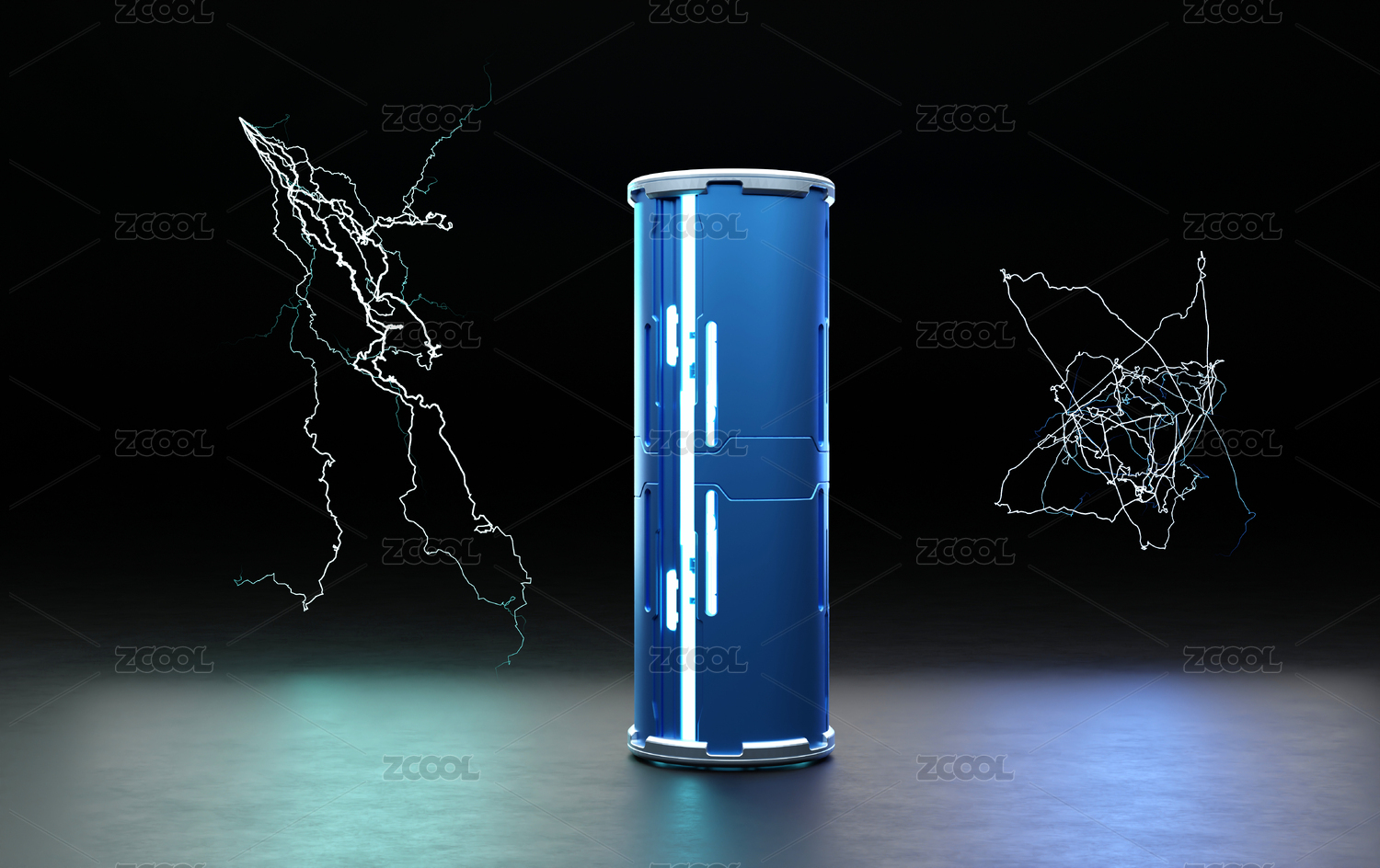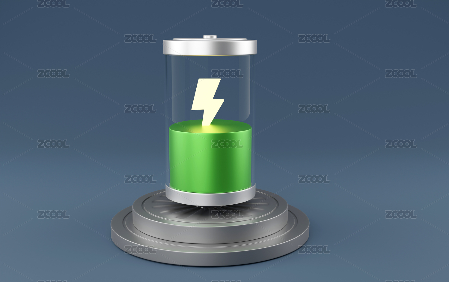 倾斜的带黄色闪电标识的3D绿色能量电池