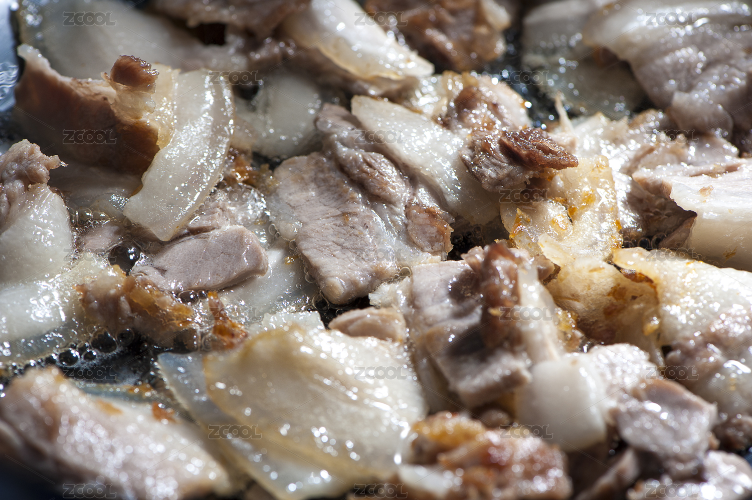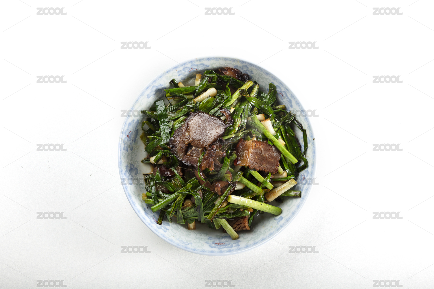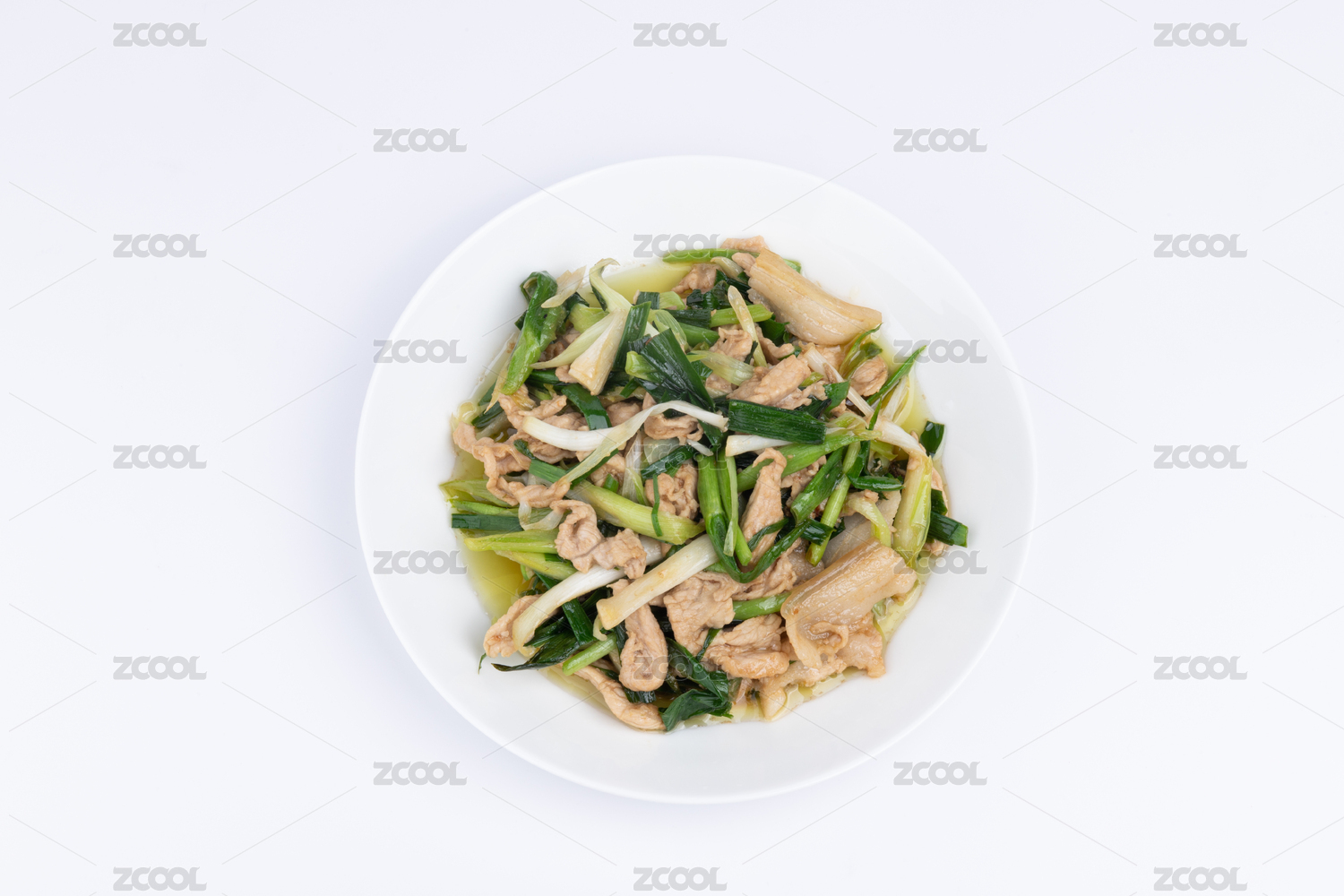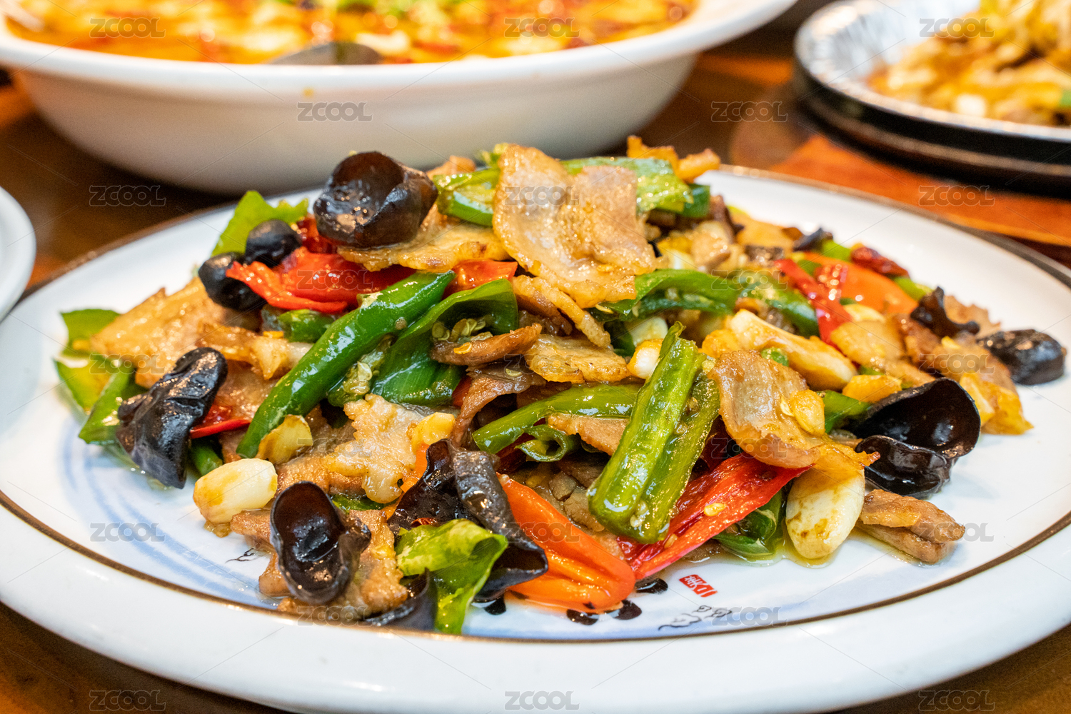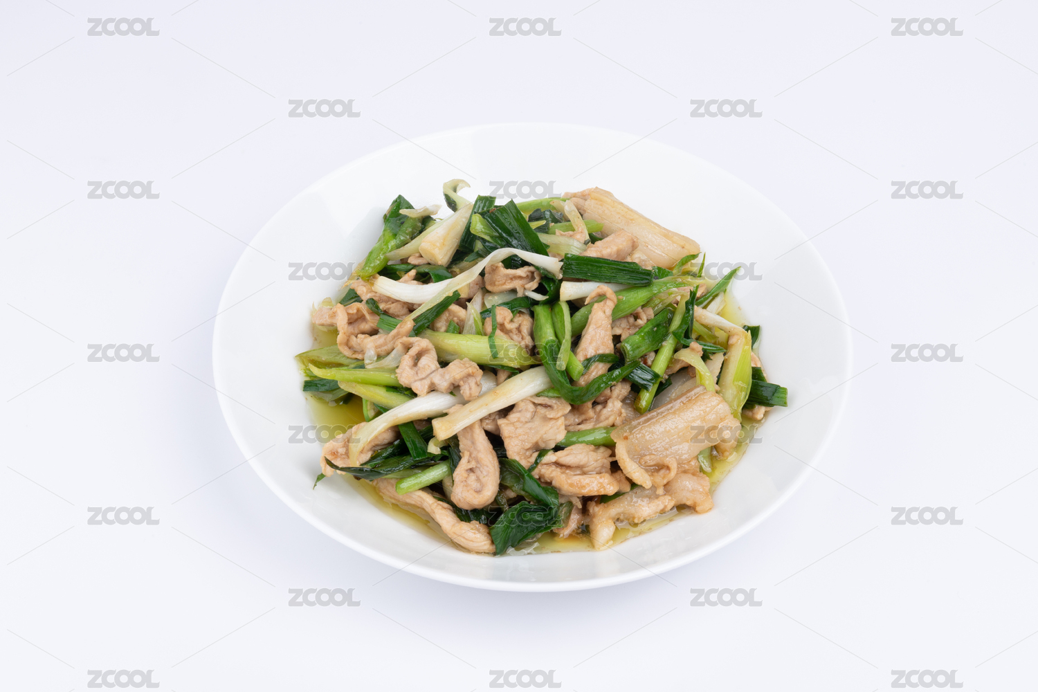 大理石背景上的麻辣白玉菇鸡腿菇炒肉
