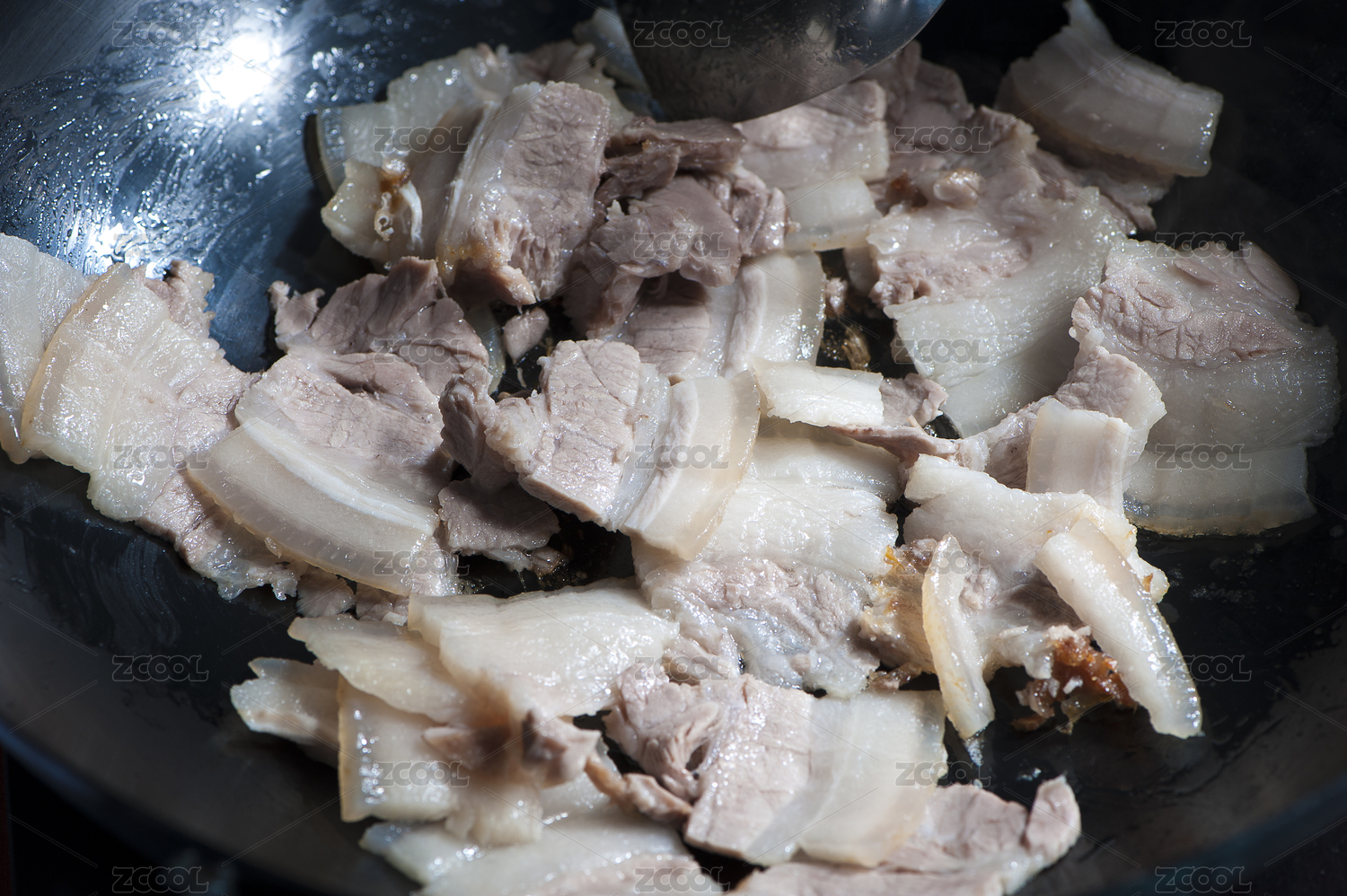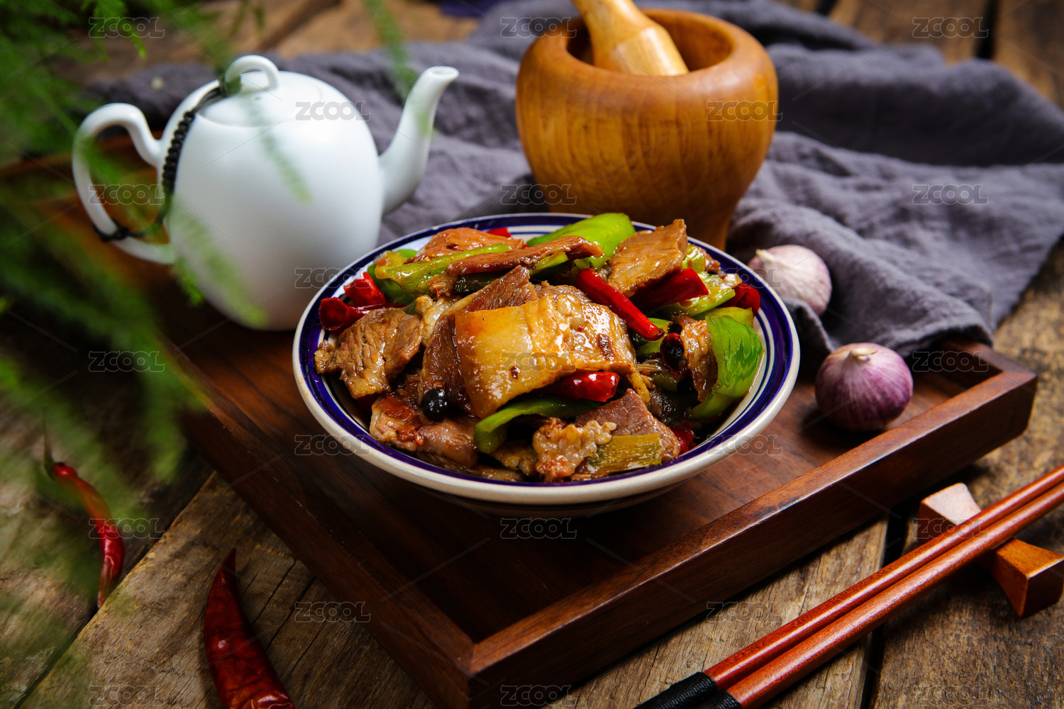 浅蓝色背景上黑色瓷碗中的辣椒炒肉