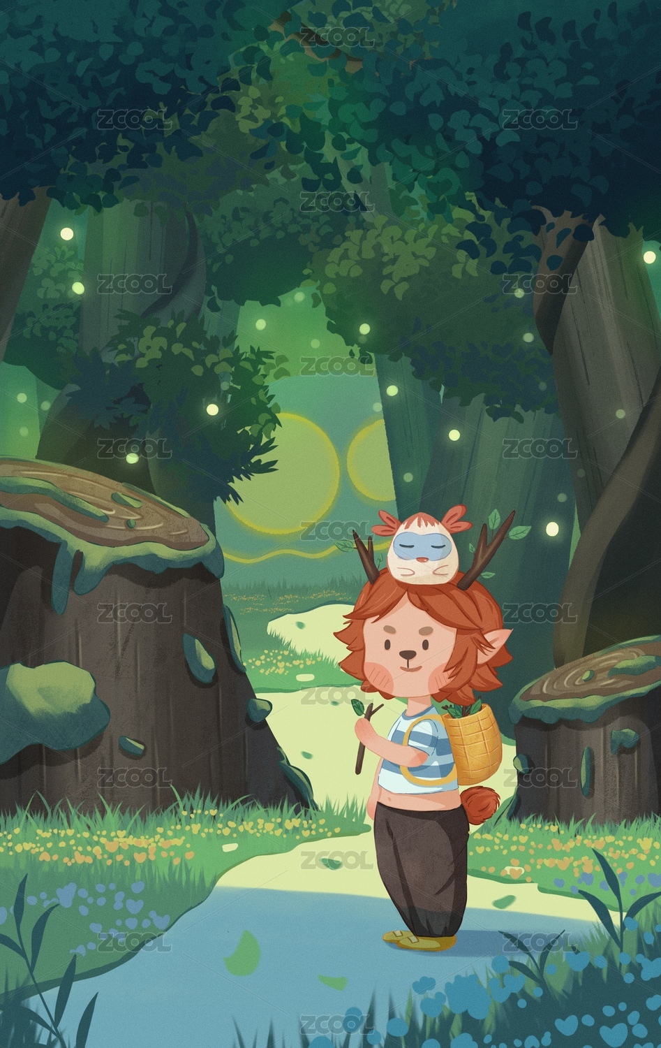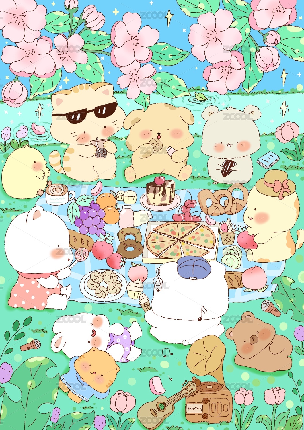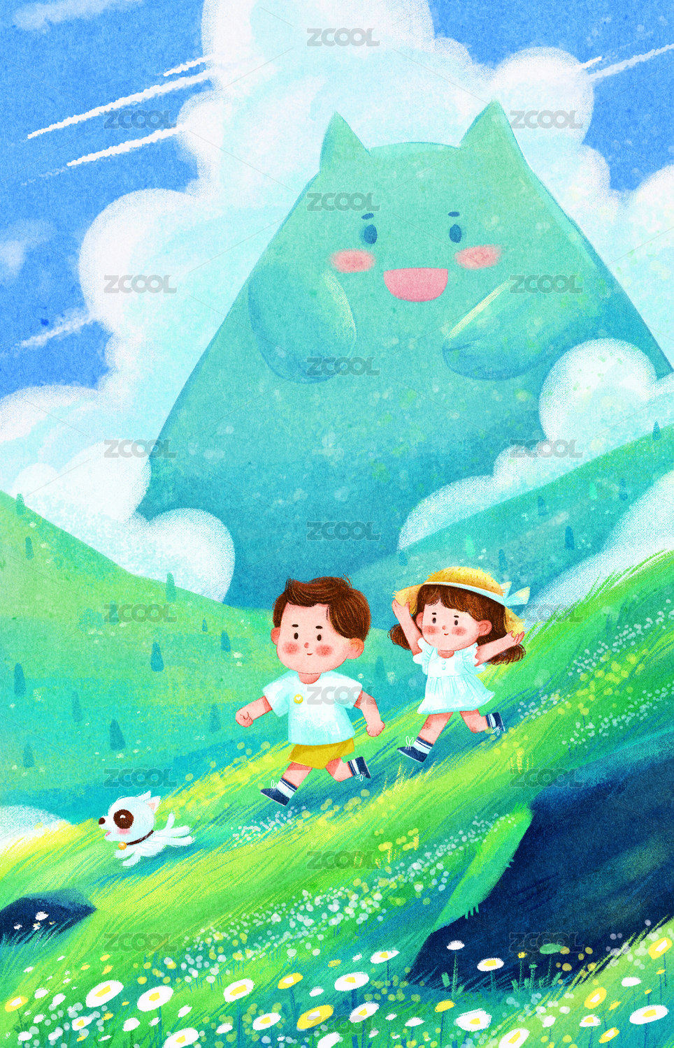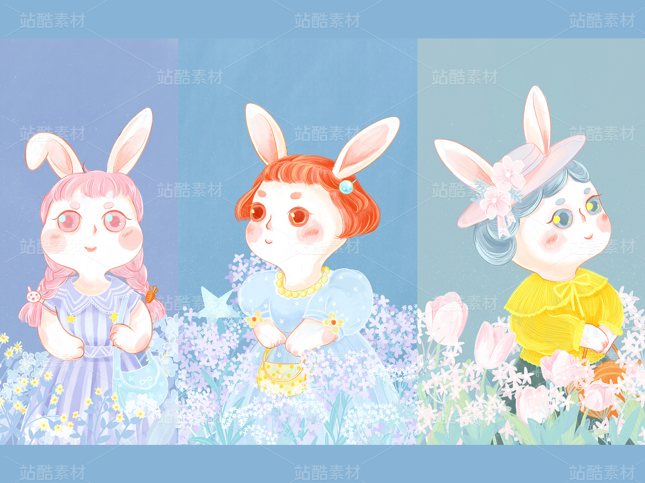 花卉花丛白色可爱穿裙子的兔小姐治愈系插画