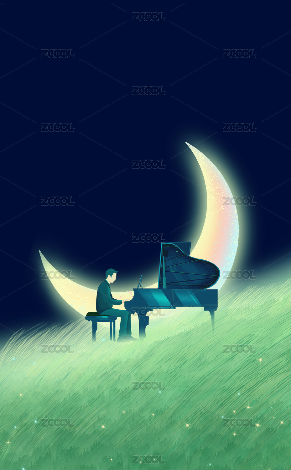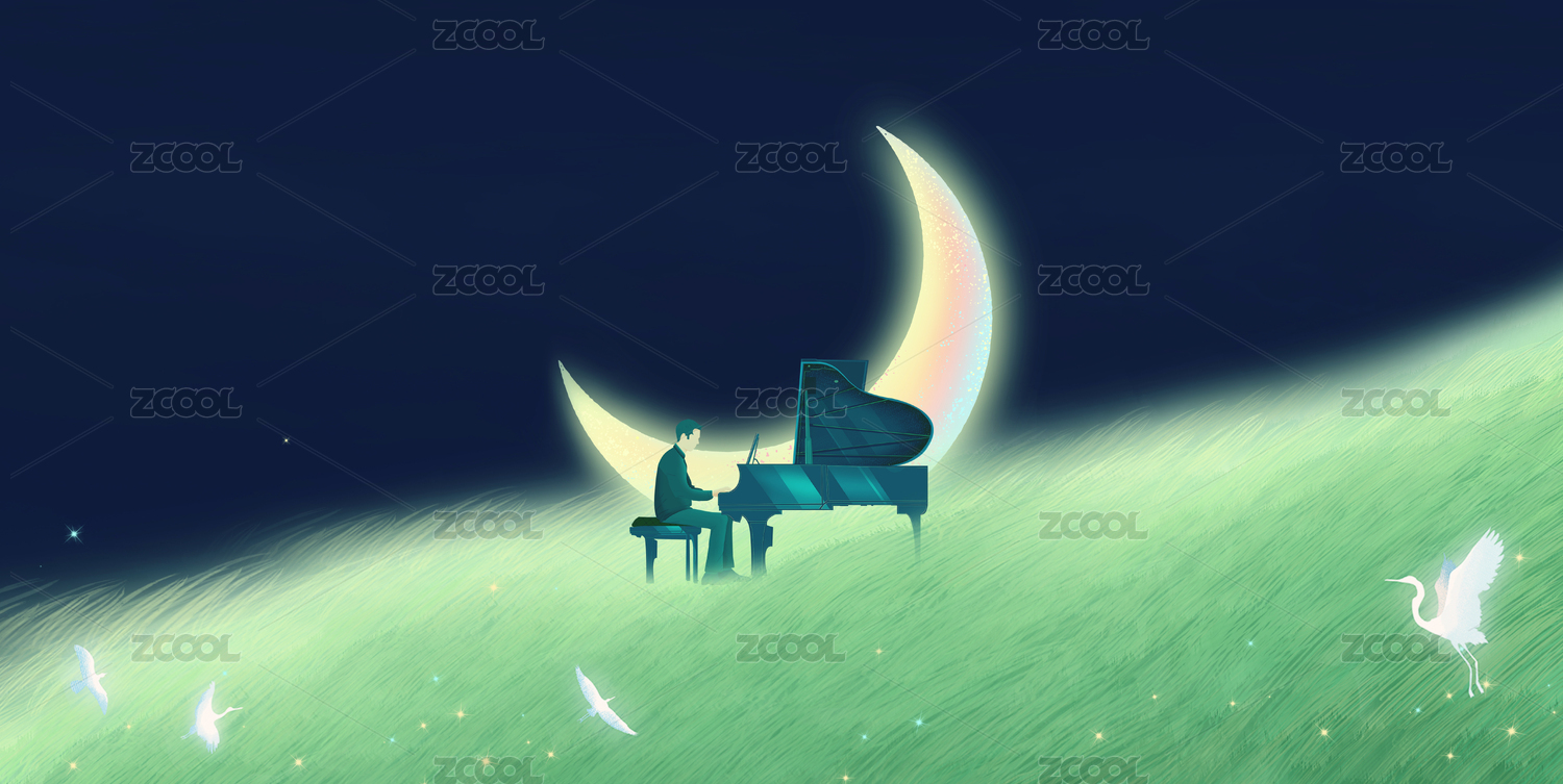 夏天的夜晚月亮躺在草坪上,一位音乐人在草坪前面弹奏钢琴插画背景海报