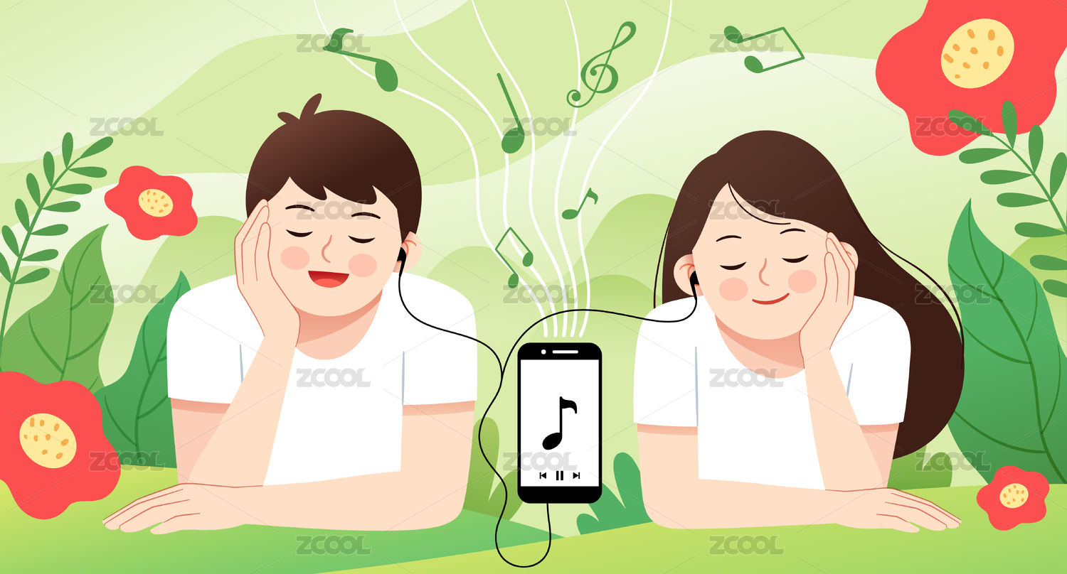 一对男女一起听音乐和花草背景