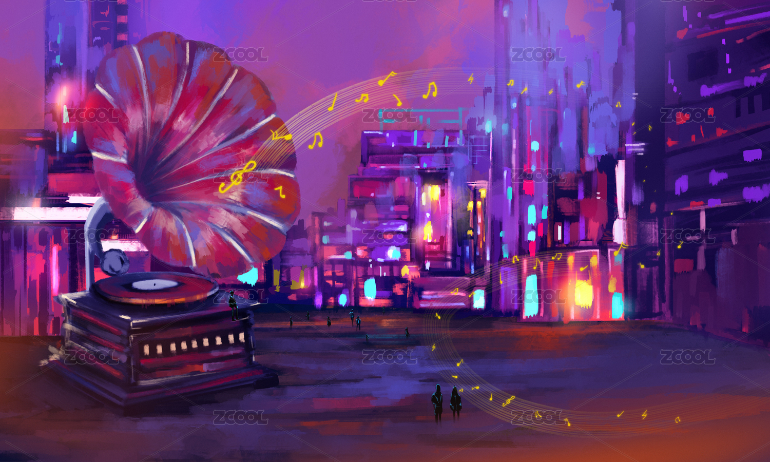 有大型留声机建筑物的城市飘荡着音符 赛博朋克音乐插画