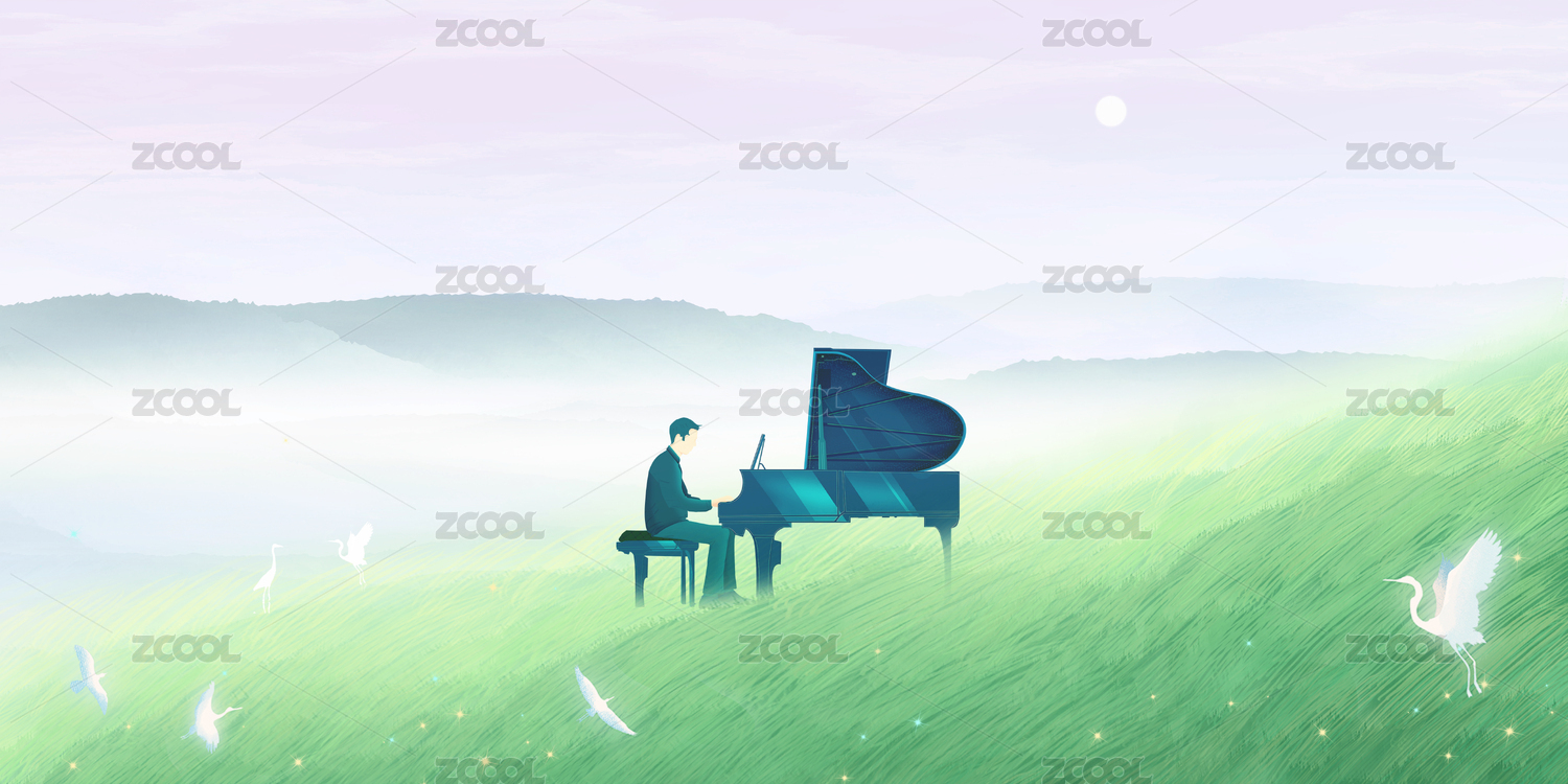 夏天晴朗的天空下,一位音乐人在草坪山坡前面弹奏钢琴插画背景海报