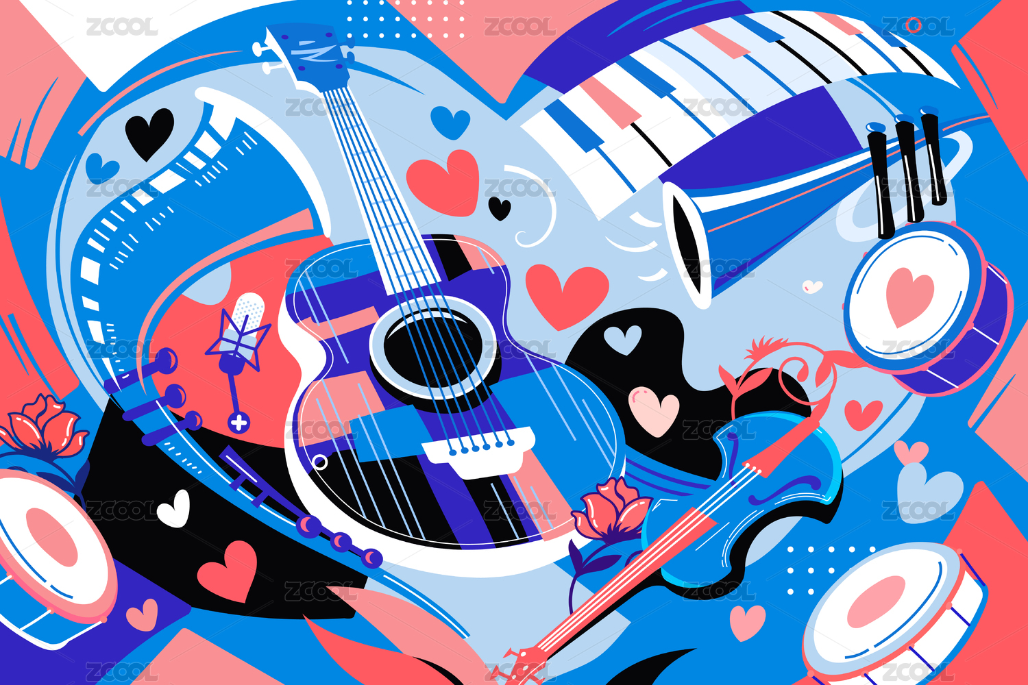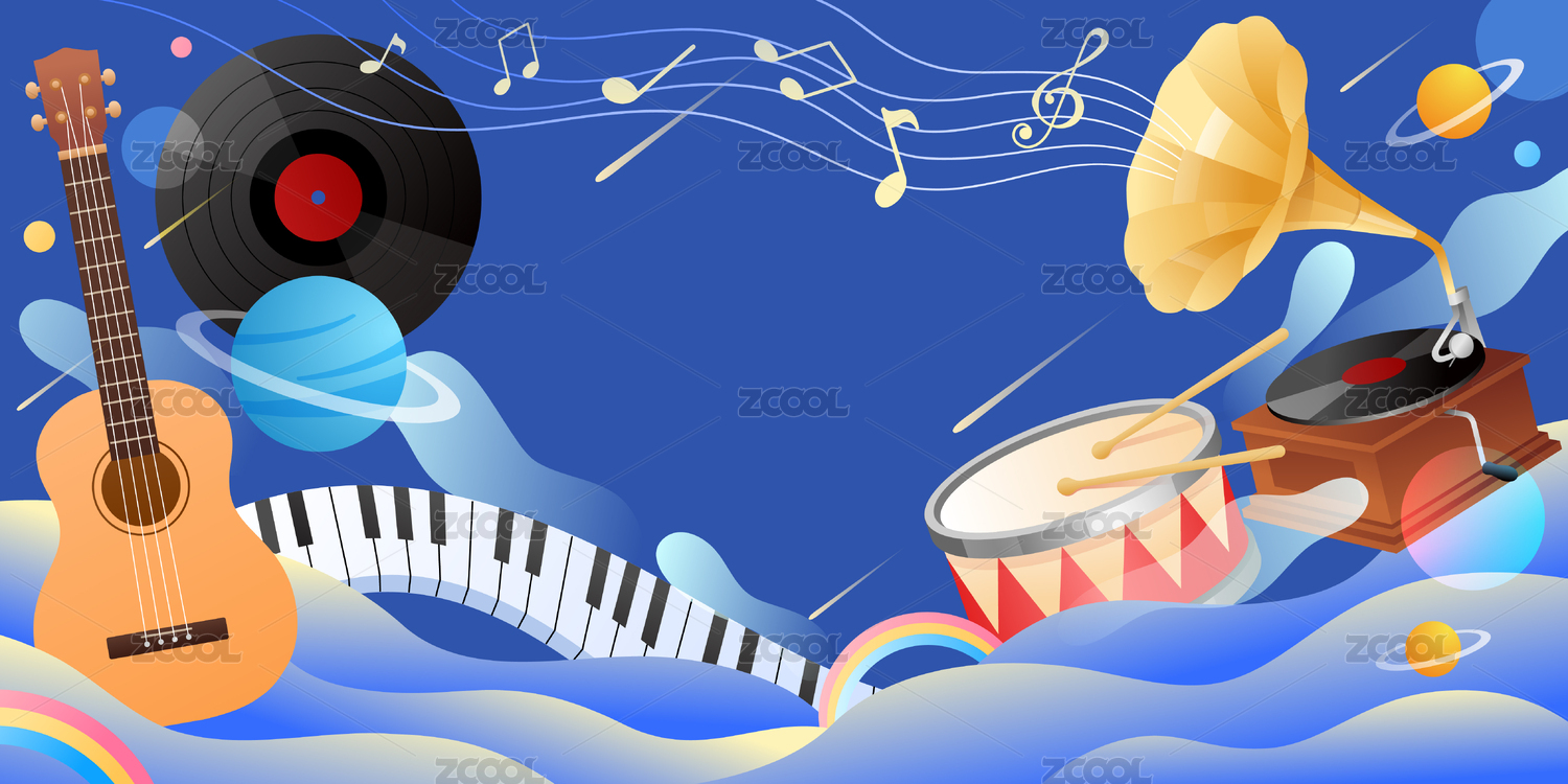 吉他鼓等乐器和留声机等音乐元素