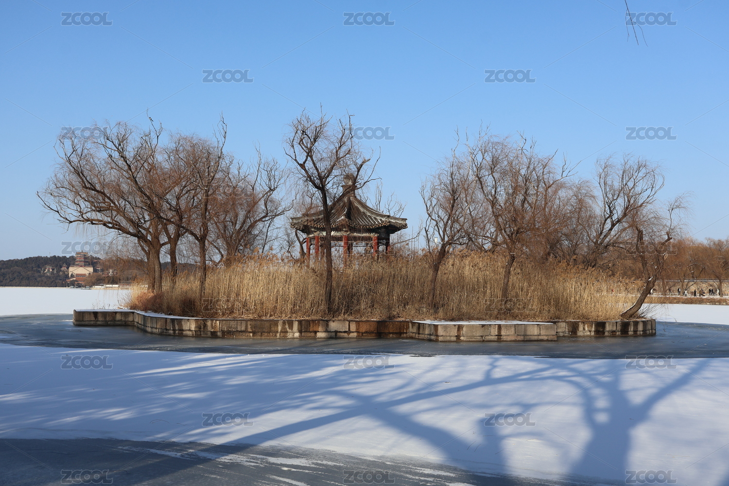 北京初雪后颐和园西堤风光