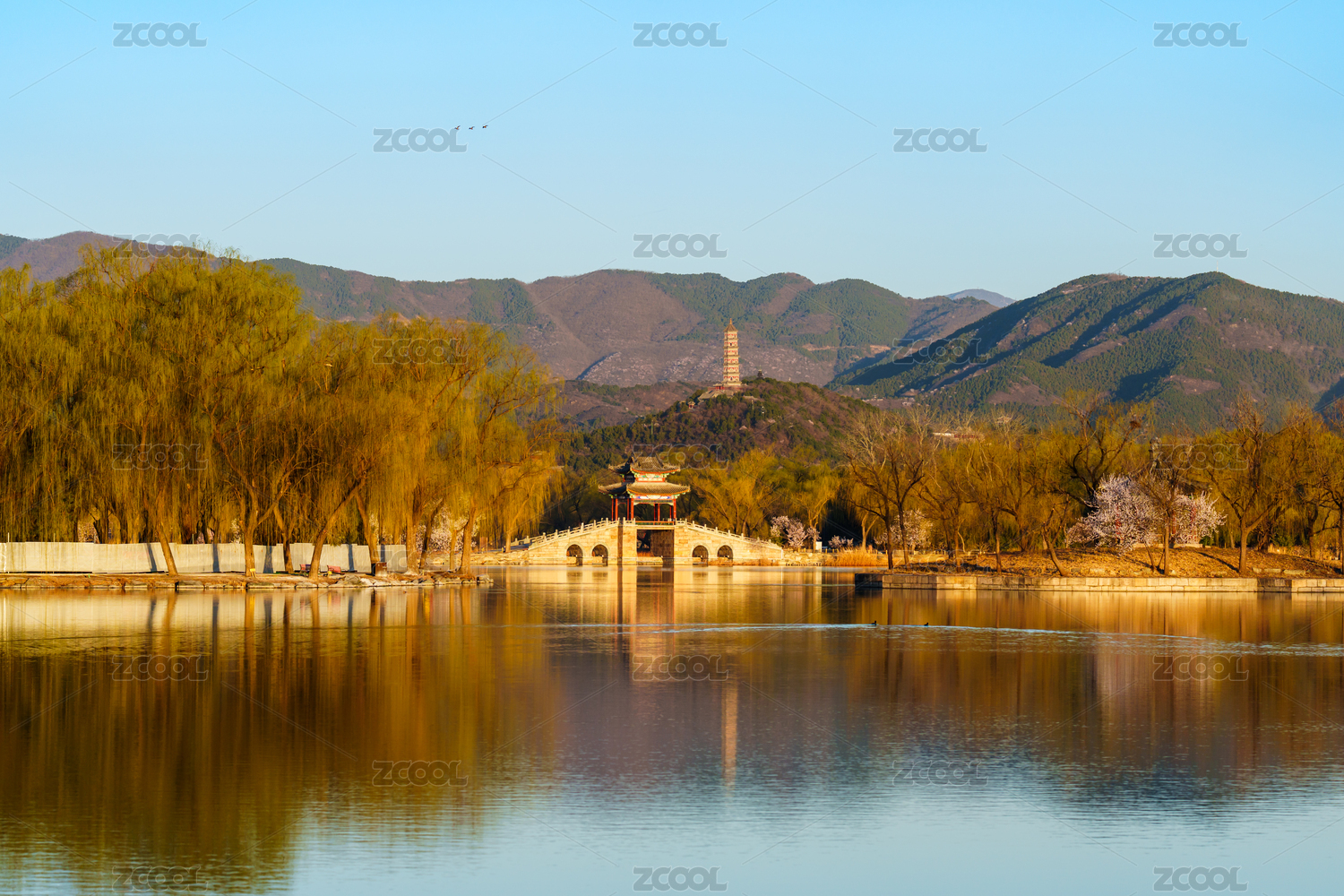 晨阳光下的颐和园西堤练桥与玉泉山玉峰塔