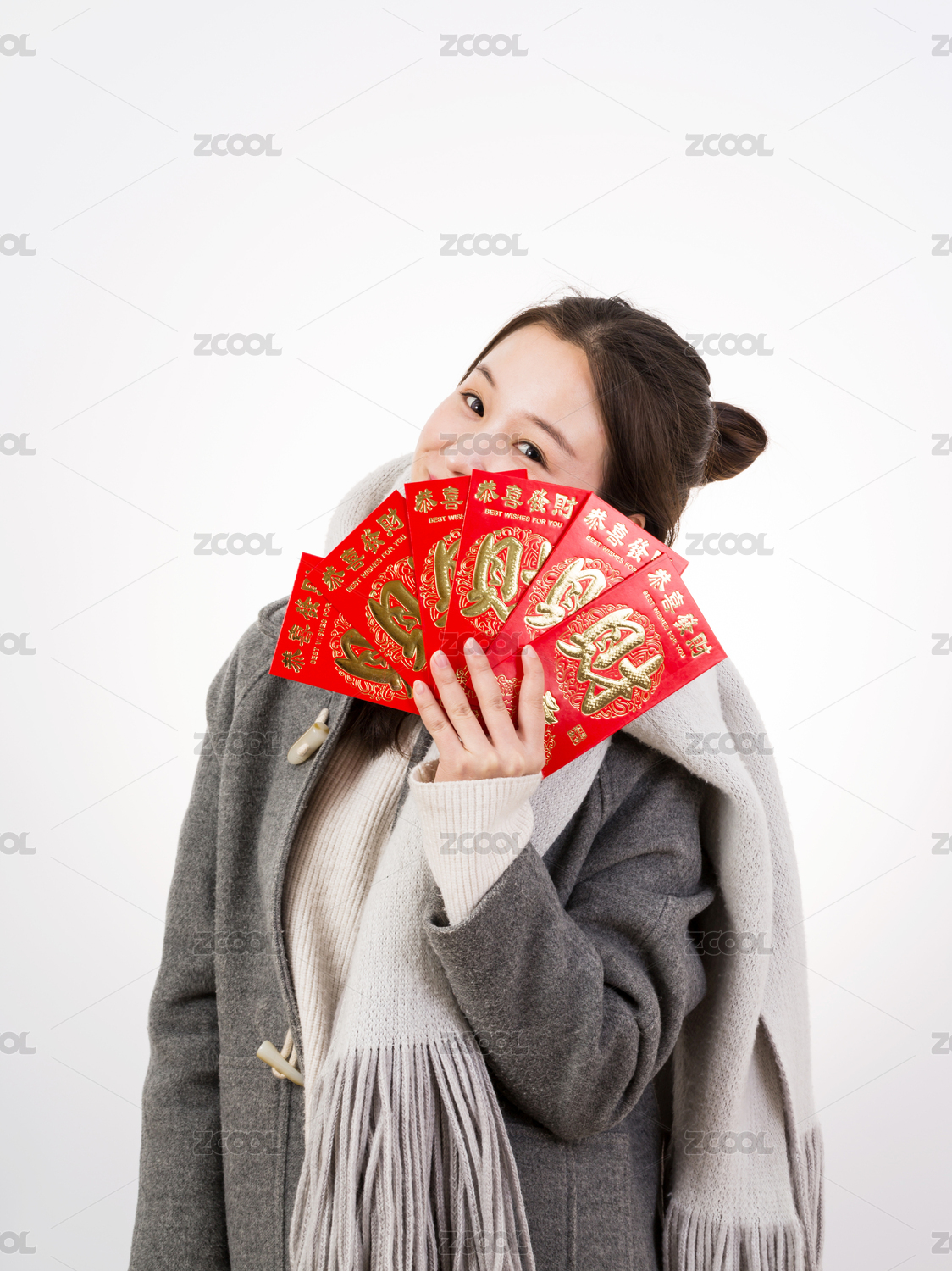 俏皮可爱的中国年轻女孩拿着红包,中国春节红包,节日祝福